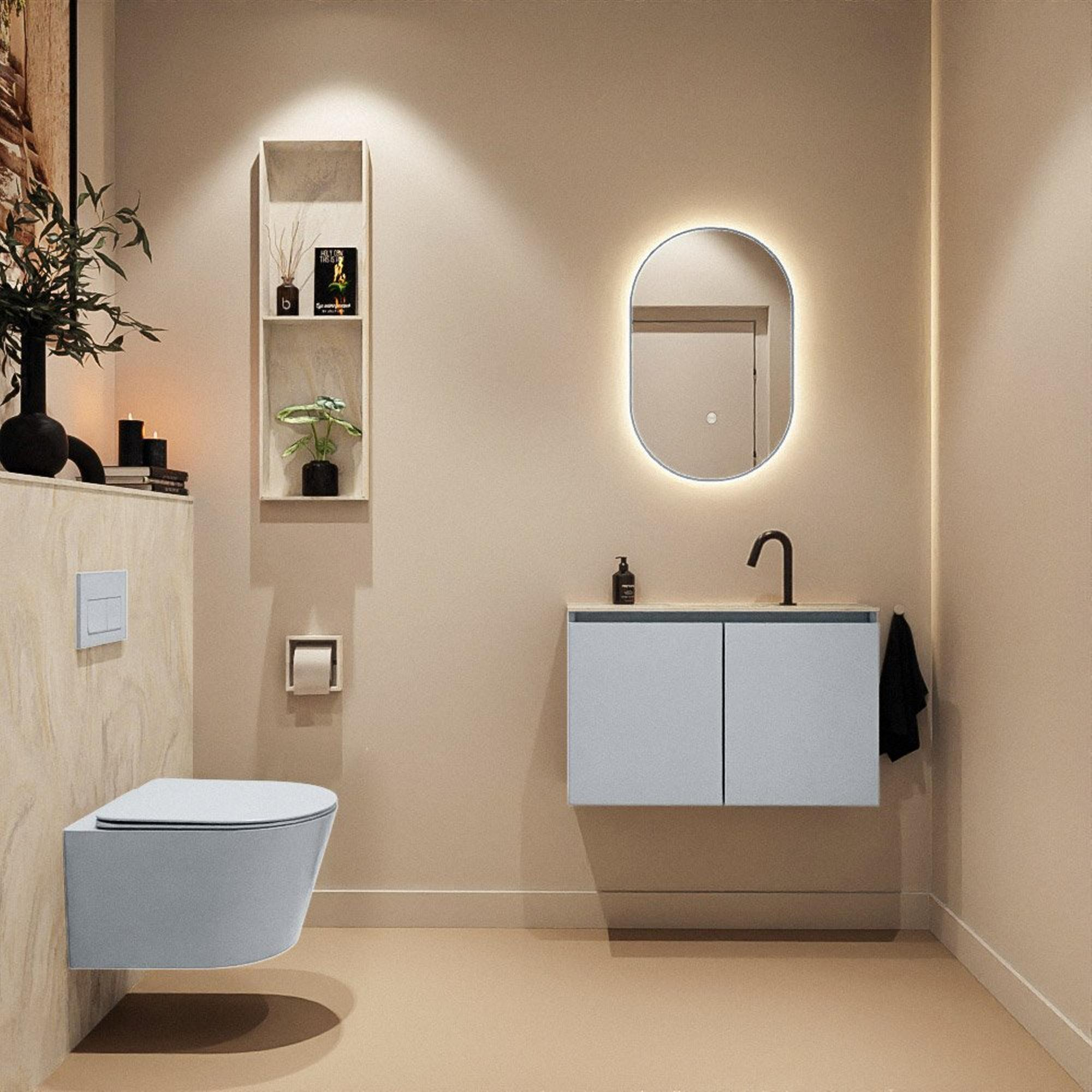 La couleur Clay est une teinte gris-brun moderne qui dégage chaleur et sérénité, sans être dominante. Le meuble se marie donc facilement aussi bien avec des éléments sanitaires blancs qu’avec des carreaux foncés ou à l’aspect pierre naturelle. Les façades sans poignées créent un jeu de lignes horizontales épuré et confèrent à l’ensemble une allure luxueuse et design. Comme aucune poignée ne dépasse, l’espace paraît visuellement plus grand et il reste agréable de circuler le long du meuble. Le style moderne en fait un excellent choix si vous souhaitez créer un espace WC contemporain où tout est soigneusement dissimulé et où l’accent est mis sur des formes sobres et des matériaux de haute qualité.