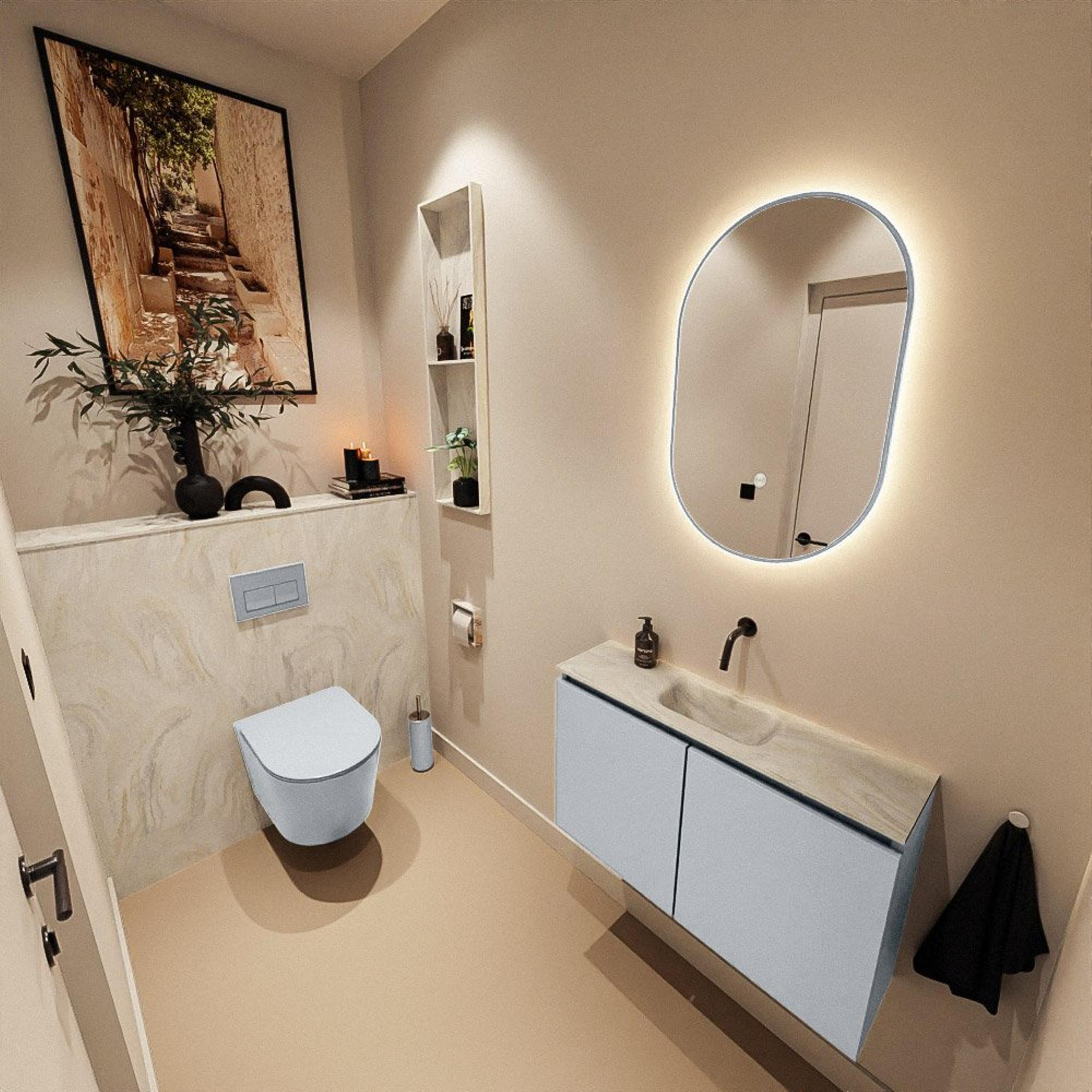 La combinaison du meuble couleur Clay et du plan de vasque crème en solid surface offre une apparence luxueuse et design que l’on retrouve souvent dans les salles de bains d’hôtels et de designer modernes. Le look mat et épuré du meuble crée un ensemble élégant, tandis que la subtile différence de couleur entre le meuble et le plan apporte justement profondeur et atmosphère. Grâce à la façade sans poignées, l’ensemble paraît sobre et minimaliste, ce qui convient parfaitement à un style moderne ou scandinave. Vous pouvez magnifiquement combiner ce meuble avec des robinets et accessoires noirs, chromés ou laiton brossé, de sorte que vous personnalisez facilement l’espace selon vos goûts. Ainsi, même dans un WC relativement petit, vous obtenez une apparence haut de gamme et bien pensée.