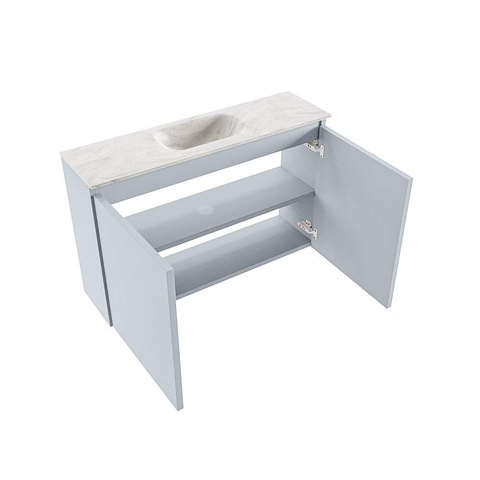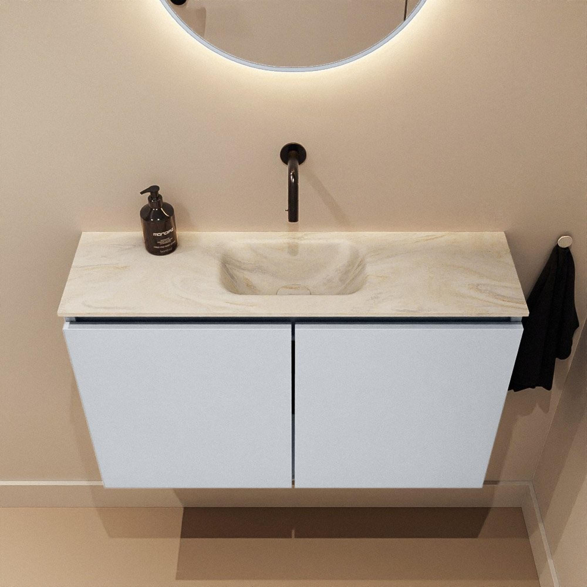 Avec une largeur de 80 cm et une faible profondeur de 23 cm, ce meuble offre un confort optimal pour se laver les mains, sans trop empiéter sur l’espace. Cela le rend particulièrement adapté aux couloirs étroits, aux petits WC ou aux salles de bains compactes où chaque centimètre compte. La vasque Eden Ostra est positionnée au milieu, ce qui vous offre une position d’utilisation centrale et agréable. Comme il n’y a pas de trou de robinet dans le plan, vous combinez la vasque avec un élégant mitigeur mural ce qui ne donne pas seulement une apparence luxueuse, mais rend également le plan plus facile à nettoyer. Les doubles portes offrent en outre un espace de rangement pratique pour les rouleaux de papier toilette, les produits d’entretien ou les serviettes invité, afin que vous gardiez tout soigneusement hors de la vue.