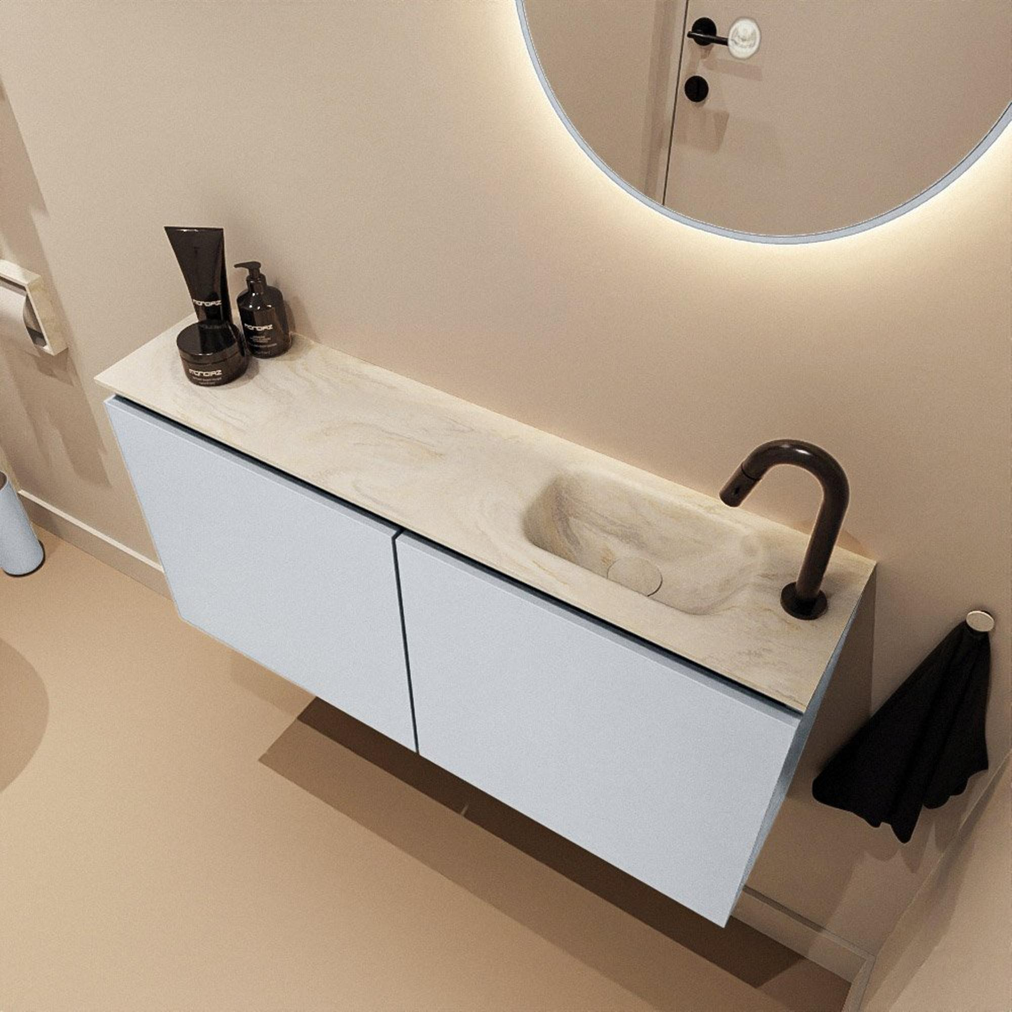 Le lavabo Eden intégré dans la couleur Ostra est fabriqué en Solid Surface, un matériau composite de haute qualité, réputé pour son aspect net et sa robustesse. La douce teinte crème s’harmonise parfaitement avec la couleur Clay du meuble et forme ainsi une combinaison intemporelle que vous pouvez facilement associer à des robinets noirs, chromés ou en métal brossé. Avec le trou de robinet à droite, cet ensemble est idéal si votre arrivée d’eau se trouve de ce côté ou si vous préférez avoir la vasque sur la droite pour une disposition logique. La surface lisse et sans joints autour du lavabo n’offre pas seulement un aspect luxueux, mais empêche également l’accumulation de saleté et rend le nettoyage bien plus simple.