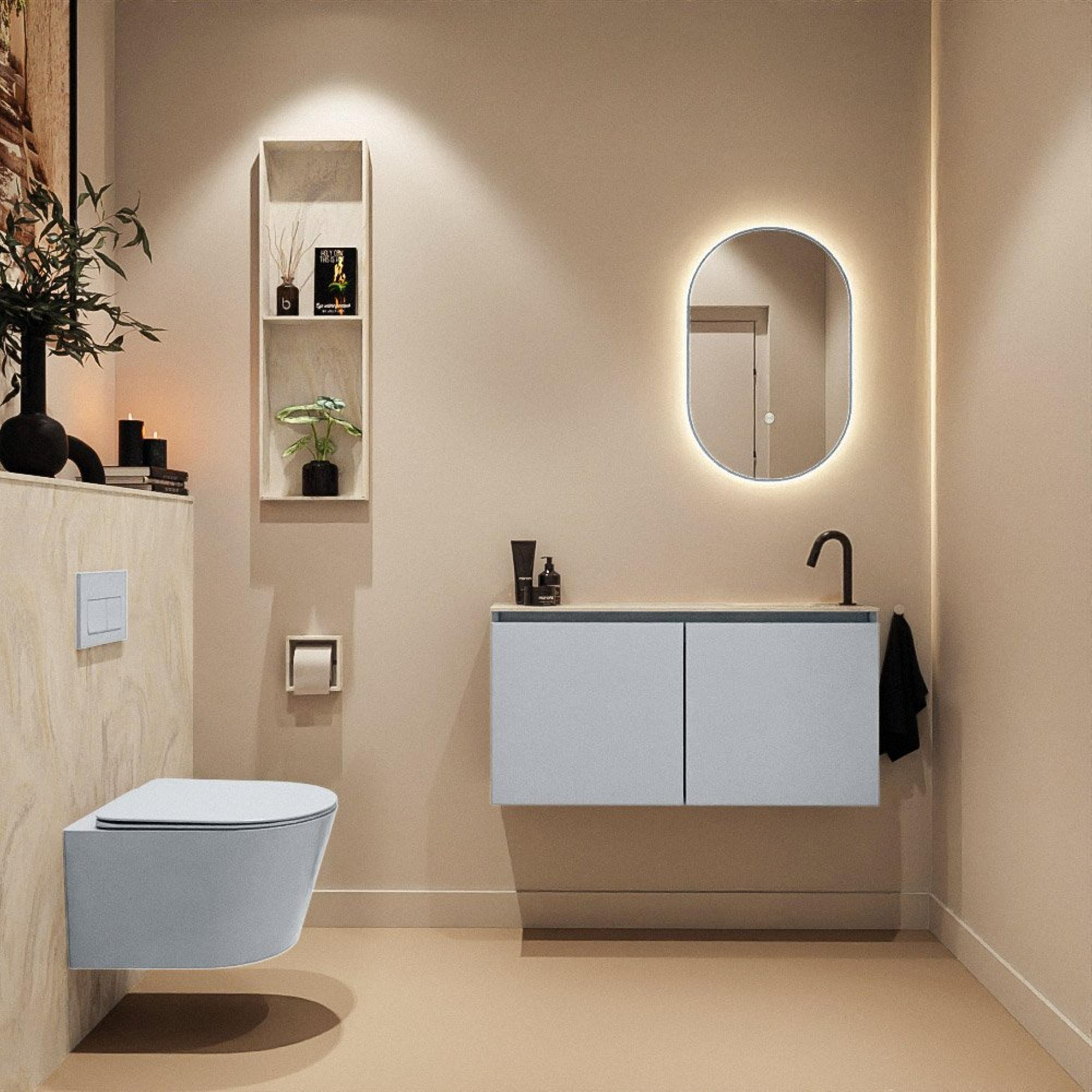 Avec une largeur de 100 cm et une profondeur de seulement 23 cm, ce meuble est idéal pour les petits espaces WC et les salles de bains compactes. Vous profitez d’une zone de lavage généreuse sans perdre d’espace de circulation précieux. La faible profondeur vous permet de vous déplacer facilement le long du meuble, ce qui est particulièrement agréable dans un WC de couloir ou près d’une porte qui s’ouvre à proximité. Les deux portes offrent un espace de rangement pratique pour le papier toilette, les produits d’entretien et les serviettes, afin que votre surface paraisse toujours bien rangée. Grâce à la façade sans poignées, l’ensemble reste épuré et discret, ce qui donne à la pièce une impression d’espace plus grande et s’intègre parfaitement à un style intérieur moderne et minimaliste.