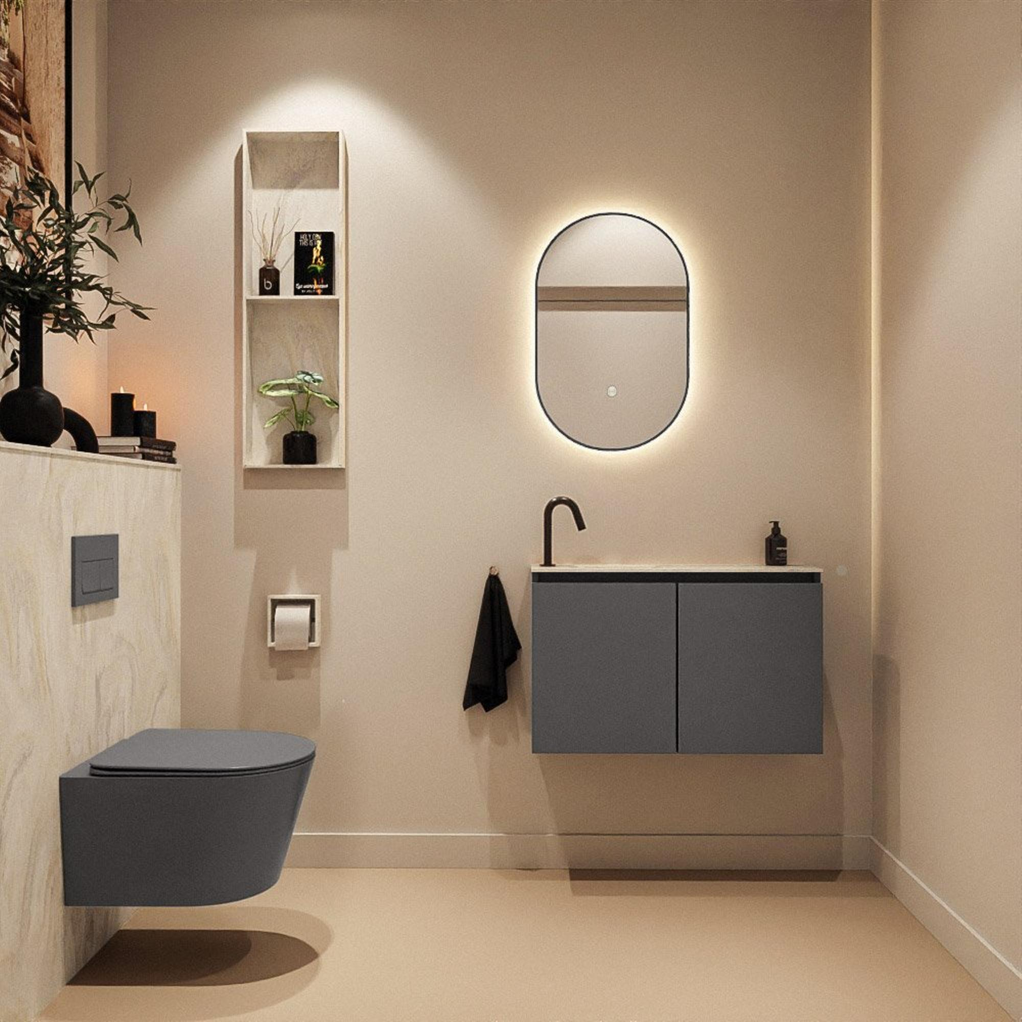 Avec une largeur de 80 cm et une profondeur de seulement 23 cm, ce meuble est spécialement conçu pour les petites salles de bains et toilettes où chaque centimètre compte. La silhouette fine et les façades sans poignées en Dark Grey offrent une apparence calme et moderne qui se marie facilement aussi bien avec des carreaux de sol aspect béton qu’avec des tons bois chaleureux ou des murs blancs épurés. Comme le meuble est suspendu au mur, le sol reste dégagé, ce qui donne non seulement une impression d’espace mais facilite également le nettoyage. Le lavabo de couleur crème crée un contraste subtil avec la couleur sombre du caisson, ce qui donne un ensemble luxueux et équilibré. Vous créez ainsi avec un seul meuble un élément accrocheur et élégant qui confère immédiatement une apparence haut de gamme à vos toilettes.