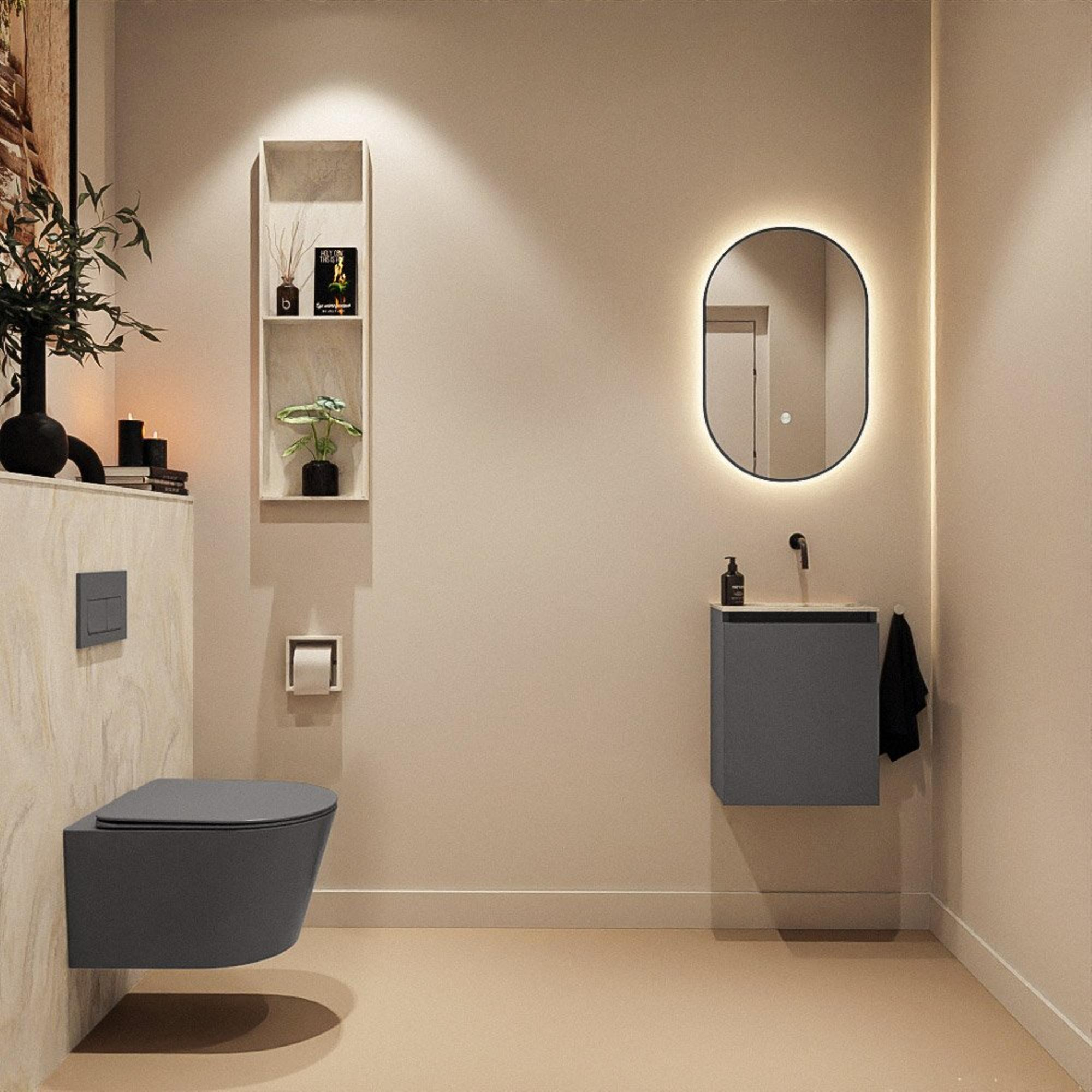 La couleur foncée du meuble en Dark Grey offre immédiatement une apparence moderne et luxueuse et se combine facilement avec des toilettes et des carreaux blancs ou colorés. Le lavabo Eden crème en solid surface forme un contraste doux avec le meuble foncé et s’harmonise à merveille avec les tons chauds et naturels de votre salle de bains ou de vos toilettes. Comme le lavabo est réalisé sans trou de robinet, l’ensemble paraît calme et épuré, surtout en combinaison avec un robinet mural élancé. Les façades sans poignée renforcent le caractère minimaliste et permettent au meuble de s’intégrer harmonieusement dans un intérieur moderne ou axé sur le design.