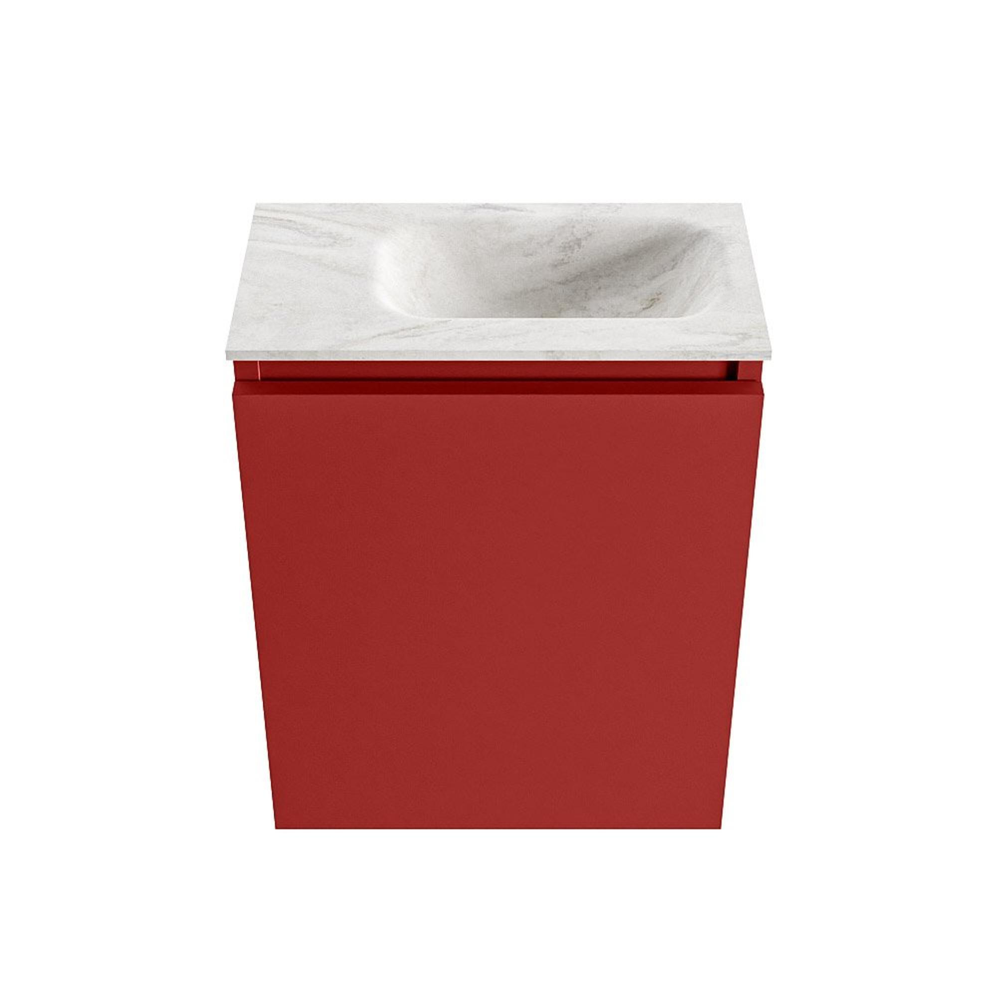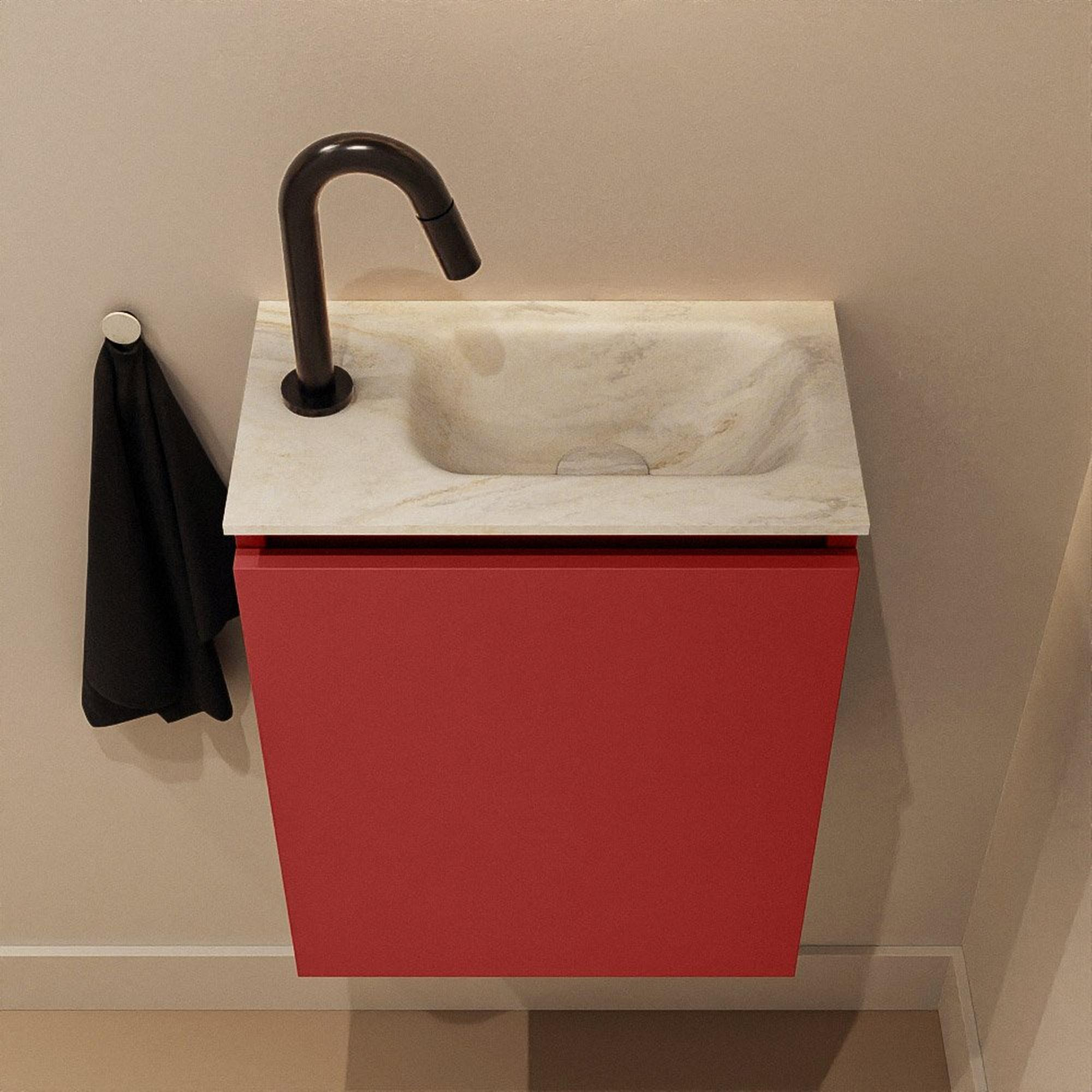 Si vous cherchez un meuble compact mais remarquable pour vos toilettes ou une petite salle de bains, alors ce meuble WC élégant est un choix judicieux. Grâce à ses dimensions peu profondes, il s'intègre sans effort dans les espaces étroits, tout en vous offrant un lavabo complet avec trou de robinet et un espace de rangement pratique derrière la porte. La combinaison du meuble dans une teinte rouge chaude et du plan vasque en Solid Surface crème et apaisant donne immédiatement à votre espace une apparence contemporaine et luxueuse. Idéal si vous voulez donner un petit plus de cachet à des toilettes pour invités, ou si, dans une salle de bains plus petite, vous ne souhaitez faire aucune concession sur le design et le confort d'utilisation. La position du robinet à droite rend en outre l'utilisation très agréable lorsque la configuration des murs l'exige, par exemple à côté d'un WC ou en face de la porte.