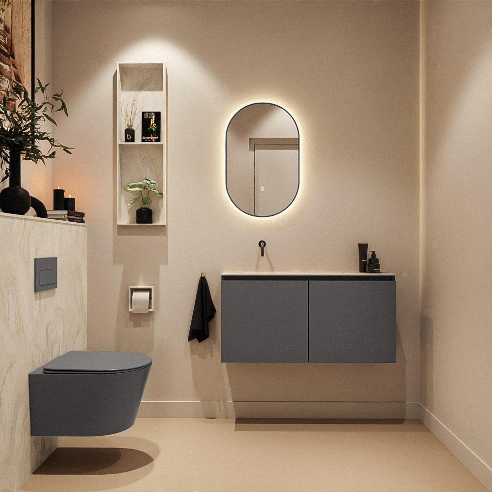 La combinaison du meuble Dark Grey avec le plan de lavabo en solid surface couleur crème offre une apparence luxueuse et apaisante qui rappelle un hôtel-boutique. Le caractère mat des matériaux paraît à la fois moderne et intemporel, et se marie facilement avec des robinets et accessoires noirs, chromés ou en métal brossé. Comme le lavabo est réalisé sans trou de robinet, vous pouvez opter pour un mitigeur surélevé posé sur le plan ou un robinet mural au-dessus du meuble. Vous créez ainsi exactement le style qui correspond à votre intérieur. La finition sans poignées souligne le caractère minimaliste : aucun élément perturbateur visible, mais une façade épurée qui se prolonge harmonieusement.