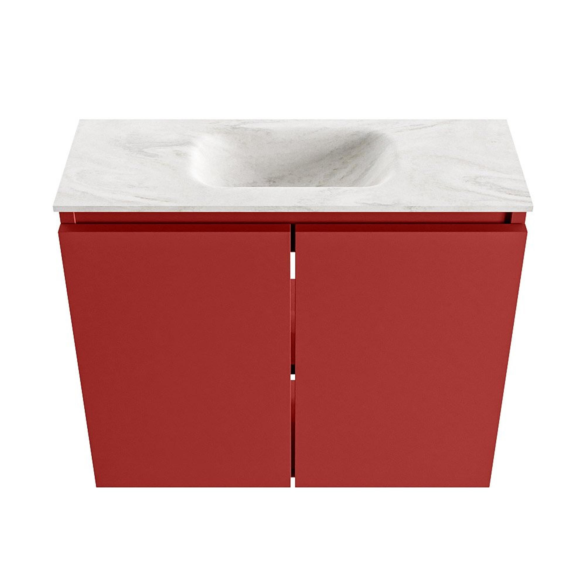 La couleur de meuble rouge Fire donne immédiatement une allure design à vos toilettes ou à votre petite salle de bains. C’est une teinte puissante qui se marie parfaitement avec des carreaux neutres, le noir, le blanc ou des accents de bois chauds. Le plan de travail en solid surface de couleur crème avec lavabo Eden en coloris Ostra ajoute un aspect raffiné, proche de la pierre naturelle. Cette combinaison paraît luxueuse sans être tape-à-l’œil et s’intègre très bien dans les intérieurs modernes et style hôtel chic. En optant pour une couleur de meuble affirmée, vous créez facilement un point focal dans un espace souvent un peu monotone, tandis que le lavabo aux lignes apaisantes maintient l’équilibre. Vous donnez ainsi à vos toilettes une touche personnelle que vous voyez et ressentez chaque jour.