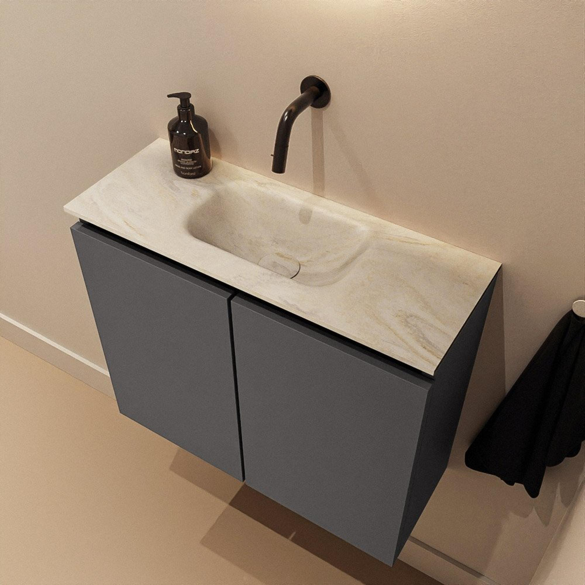 Le meuble gris foncé combiné au plan de toilette en Solid Surface couleur crème crée un look moderne et élégant qui apporte immédiatement de l'ambiance à vos toilettes ou à votre salle de bains. La teinte de gris profonde et neutre se marie facilement avec des carreaux muraux blancs, un effet béton, des accents de bois ou au contraire des touches de couleur marquées. Le plan en Solid Surface présente une finition mate et épurée qui rappelle les salles de bains design haut de gamme. Comme la vasque est positionnée au milieu, l'ensemble paraît symétrique et calme, idéal si vous aimez un aménagement minimaliste et équilibré. Vous donnez ainsi une allure haut de gamme et bien pensée même à la plus petite des pièces.