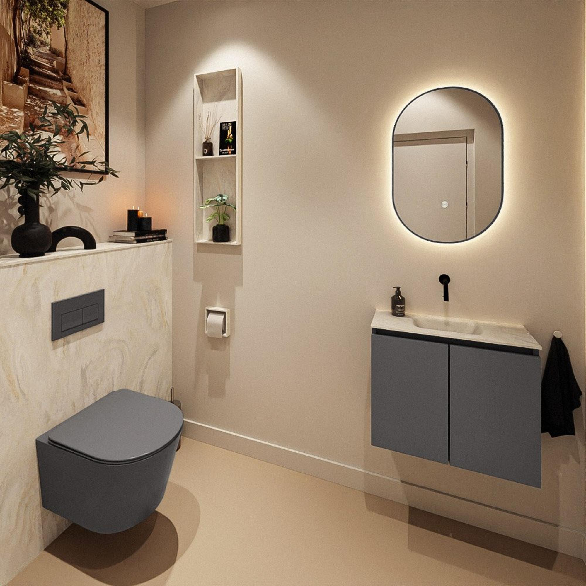 Avec une largeur de 60 cm et une profondeur de seulement 23 cm, ce meuble WC offre exactement ce dont vous avez besoin dans les espaces compacts : suffisamment de surface de dépose et un lavabo à part entière, sans que le passage ne devienne trop étroit. La faible profondeur évite de vous cogner en entrant ou en sortant, ce qui est un grand avantage surtout dans les petites toilettes. En même temps, la largeur de 60 cm assure une impression de calme sur le mur et le lavabo reste confortable à utiliser, même par plusieurs membres du foyer par jour. Vous exploitez ainsi l'espace disponible de manière efficace, tout en donnant à la pièce une apparence plus grande et plus aérée.