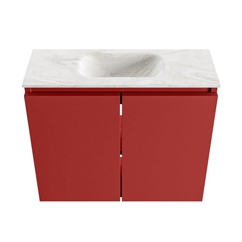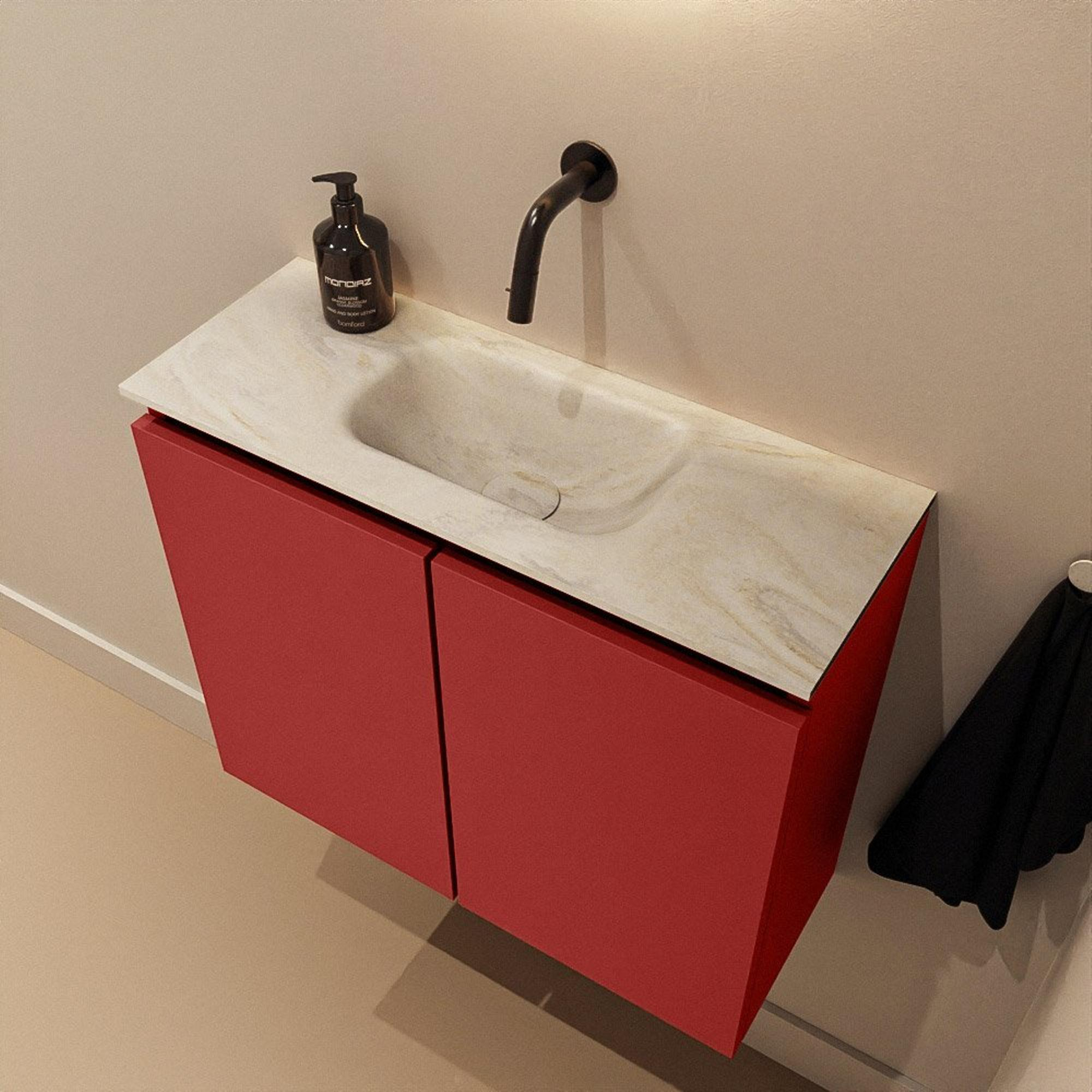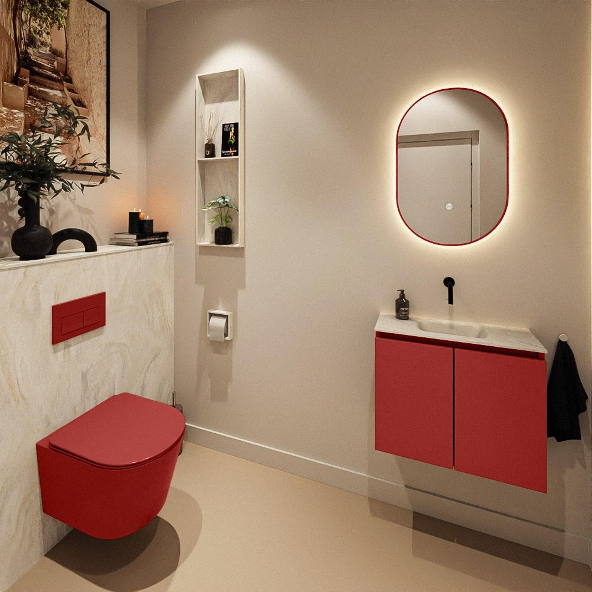 Le meuble bas est réalisé en MDF et fini dans la couleur Fire, une teinte rouge contemporaine qui donne immédiatement du caractère à vos toilettes. En combinaison avec les façades sans poignées, il en résulte des lignes modernes et épurées, tandis que la couleur chaude crée justement une atmosphère accueillante et personnelle. Le MDF est par ailleurs un matériau très prisé pour les meubles de salle de bains : stable, offrant une finition nette et adapté à un look moderne et uniforme. En combinant ce meuble avec des accessoires assortis, tels qu'un miroir élégant et un petit robinet de fontaine épuré, vous créez facilement un ensemble cohérent qui donne l'impression d'un design bien pensé plutôt que d'un assemblage de composants séparés.