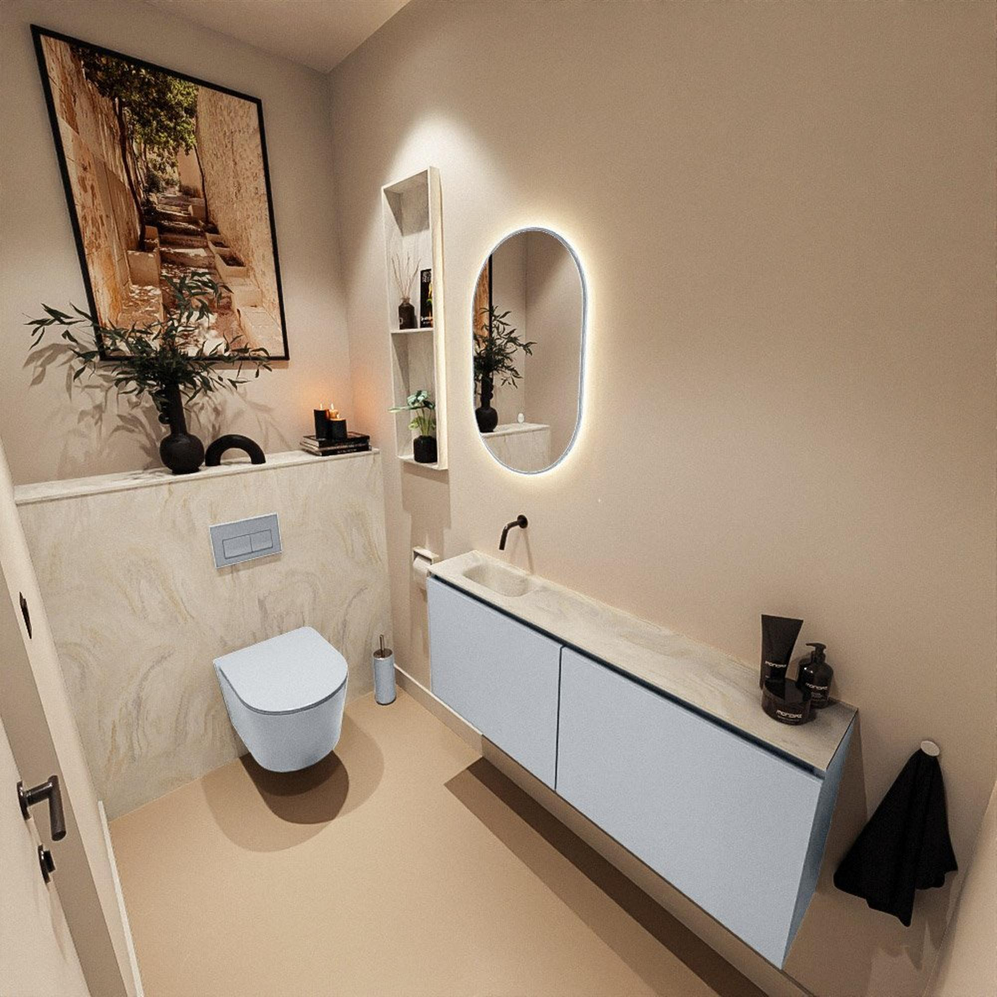 La subtile teinte grise Clay confère au meuble une apparence moderne mais chaleureuse, qui s’intègre parfaitement aux salles de bains et toilettes contemporaines. Associée au plan en solid surface crème et au lavabo couleur Ostra, elle crée un contraste doux qui s’accorde aisément aussi bien avec des carreaux clairs qu’avec un effet béton ou des accents en bois. La façade sans poignées met en valeur les lignes épurées et assure une impression calme et ordonnée. Cette combinaison de couleurs se prête idéalement à un aménagement moderne et minimaliste, tout en restant chaleureuse grâce à sa nuance douce. Vous créez ainsi un élément phare élégant qui ne s’impose pas visuellement, mais s’intègre avec raffinement à l’ensemble de votre intérieur.