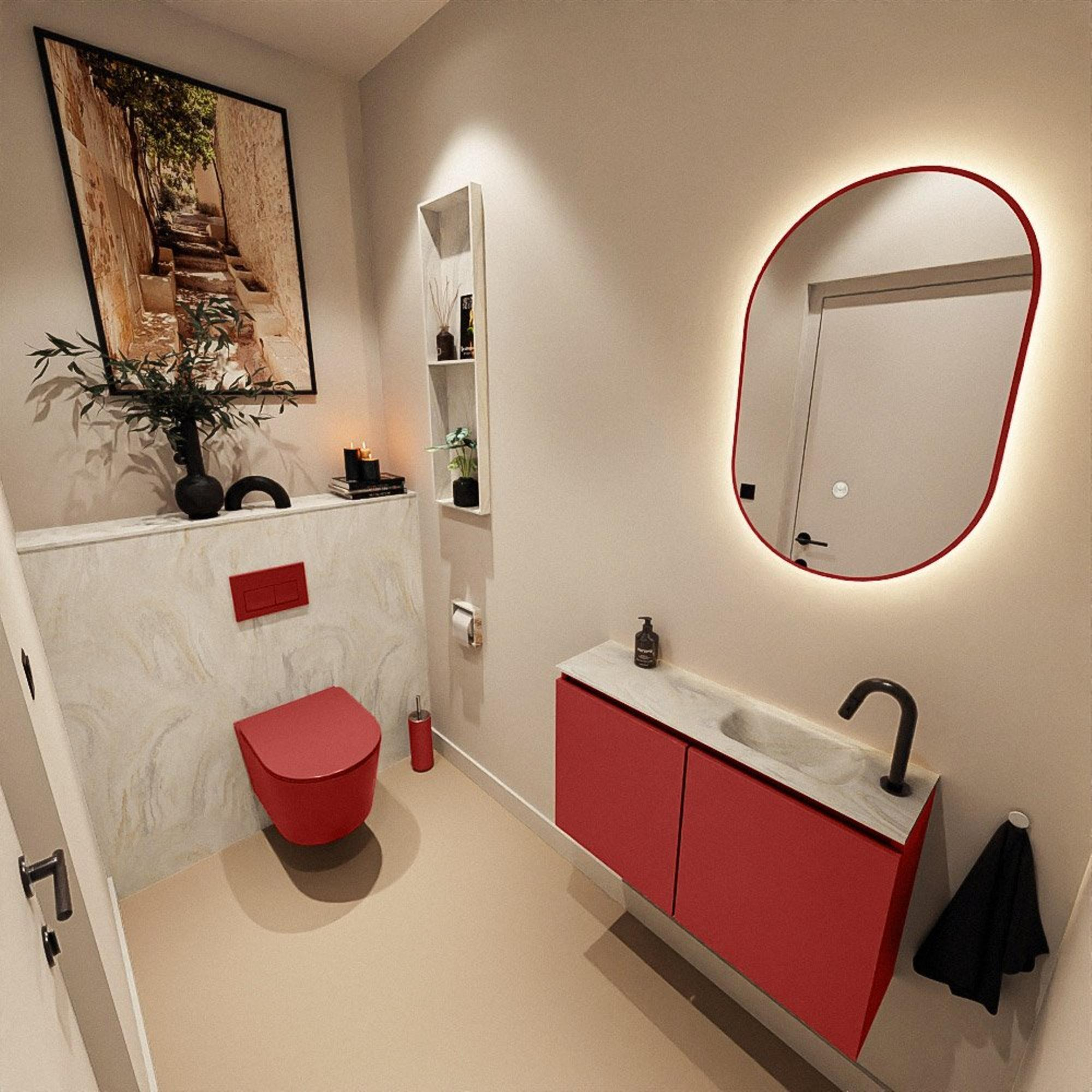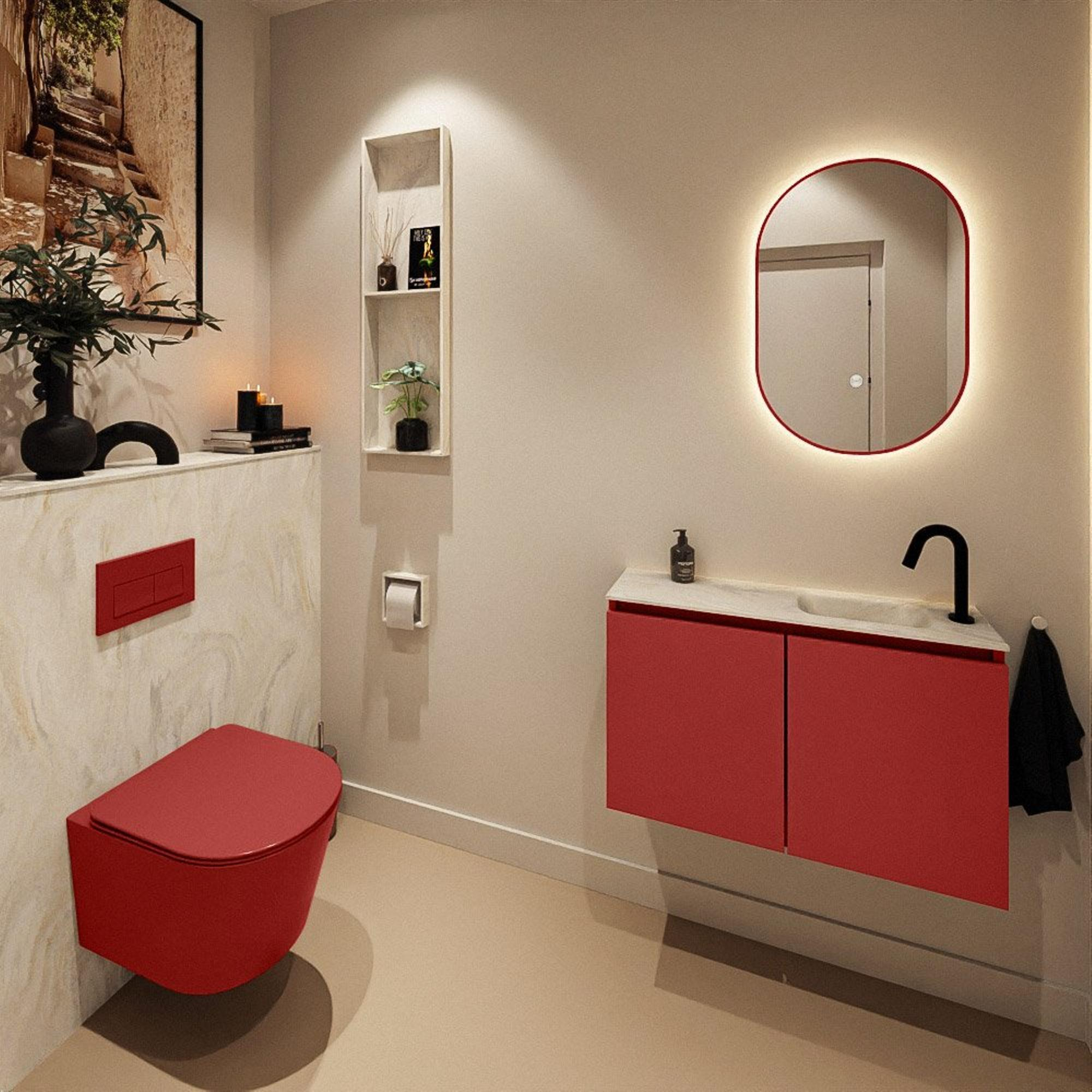 La couleur de meuble Fire donne à votre espace toilettes un caractère fort et contemporain. Le rouge profond apporte chaleur et personnalité, tandis que le plan en solid surface couleur crème assure équilibre et sérénité. Cette combinaison se prête parfaitement aux intérieurs modernes, mais peut aussi constituer un accent audacieux dans une salle de bains par ailleurs calme et lumineuse. Comme le meuble est sans poignées, la façade paraît épurée et minimaliste et la couleur est encore mieux mise en valeur. Combinez-le par exemple avec un robinet noir mat ou chromé et un miroir simple pour créer une ambiance d’hôtel de luxe, même dans la plus petite pièce de votre maison.
