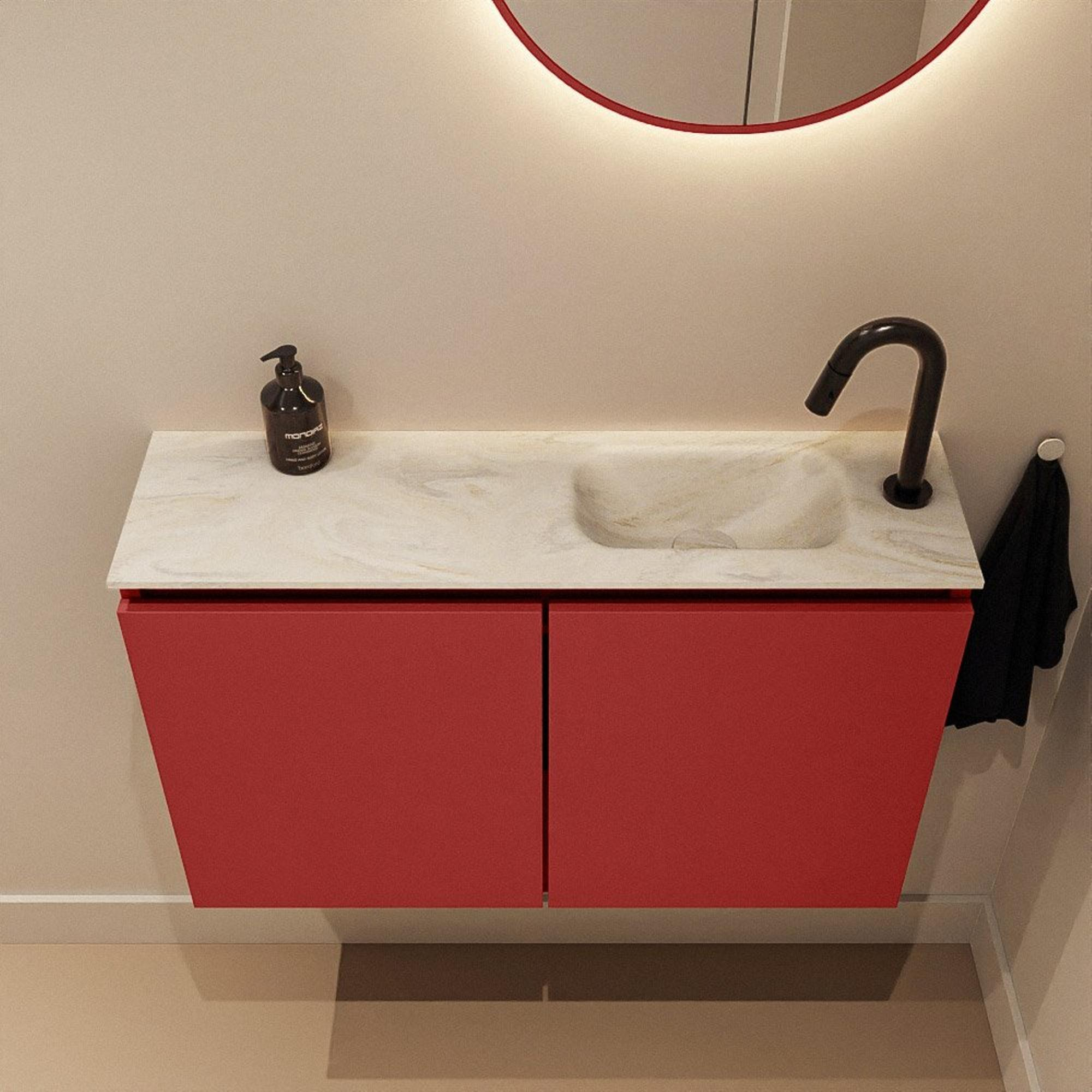 Ce set compact est idéal si vous souhaitez installer un lavabo à la fois élégant et pratique dans un espace toilettes ou une petite salle de bains. Grâce à la faible profondeur, ce meuble s’intègre facilement dans une niche étroite ou le long d’un mur étroit, sans perdre d’espace de circulation. La combinaison d’une couleur de meuble rouge marquante et d’un lavabo en solid surface crème et apaisant crée un aspect moderne et design qui attire immédiatement le regard sans pour autant dominer. Grâce à la position du trou de robinet à droite, ce modèle est particulièrement adapté lorsque votre installation de conduites ou la disposition de la porte l’exige, ou si vous souhaitez actionner le robinet aisément de la main droite. Si vous recherchez un meuble de toilettes peu profond qui ajoute de l’ambiance tout en étant fonctionnel et facile d’entretien, ce set est un choix particulièrement judicieux.