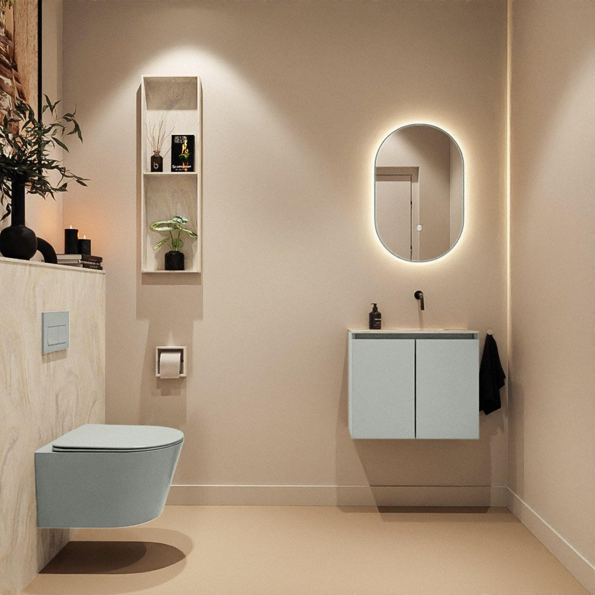 La couleur Greey du meuble donne immédiatement à vos toilettes une base moderne et apaisante. Il s’agit d’une teinte de gris contemporaine à l’allure subtile et chic qui se marie facilement aussi bien avec des accents sanitaires blancs qu’avec des tons bois chaleureux ou des accessoires noirs. Le plan de vasque en solid surface de couleur crème offre un contraste doux et un aspect haut de gamme, comme si vous aviez fait réaliser un plan sur mesure. Grâce au design sans poignées, l’ensemble paraît minimaliste et épuré : vous ne voyez aucune poignée saillante, ce qui donne une impression de grandeur à l’espace. Cette combinaison est parfaite pour les salles de bains et toilettes modernes, scandinaves ou esprit hôtel de luxe, et constitue une base intemporelle dont vous profiterez pendant de nombreuses années.