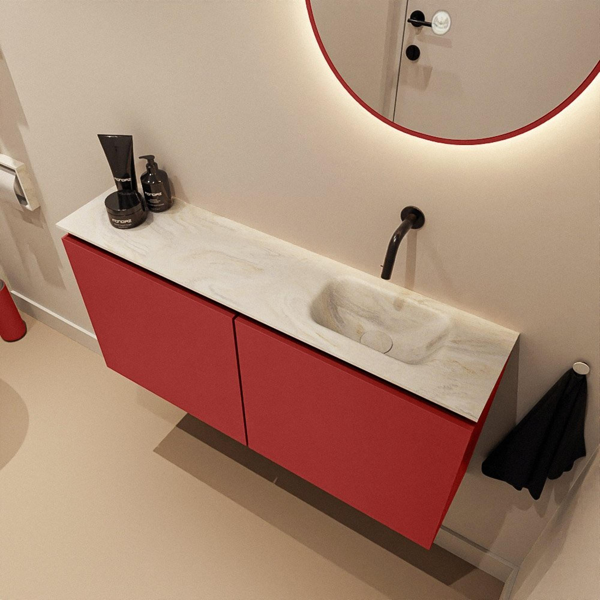 La couleur chaleureuse Fire donne immédiatement du caractère à vos WC ou à votre petite salle de bains. La façade présente un design moderne et entièrement sans poignées, ce qui confère à l’ensemble un aspect sobre qui s’intègre parfaitement dans un intérieur épuré et contemporain. La combinaison avec le plan de toilette crème en solid surface crée un contraste subtil qui respire le luxe sans être criard. Grâce à la faible profondeur de seulement 23 cm, le meuble dépasse très peu dans la pièce, ce qui est idéal le long d’un mur de couloir étroit ou dans des WC exigus. Vous conservez ainsi suffisamment d’espace pour circuler, tout en disposant d’un meuble généreux de 100 cm de large qui vient aligner visuellement le mur. Que vous optiez pour un style moderne, hôtel chic ou résolument design, ce meuble constitue une base solide pour le reste de vos équipements sanitaires et accessoires.