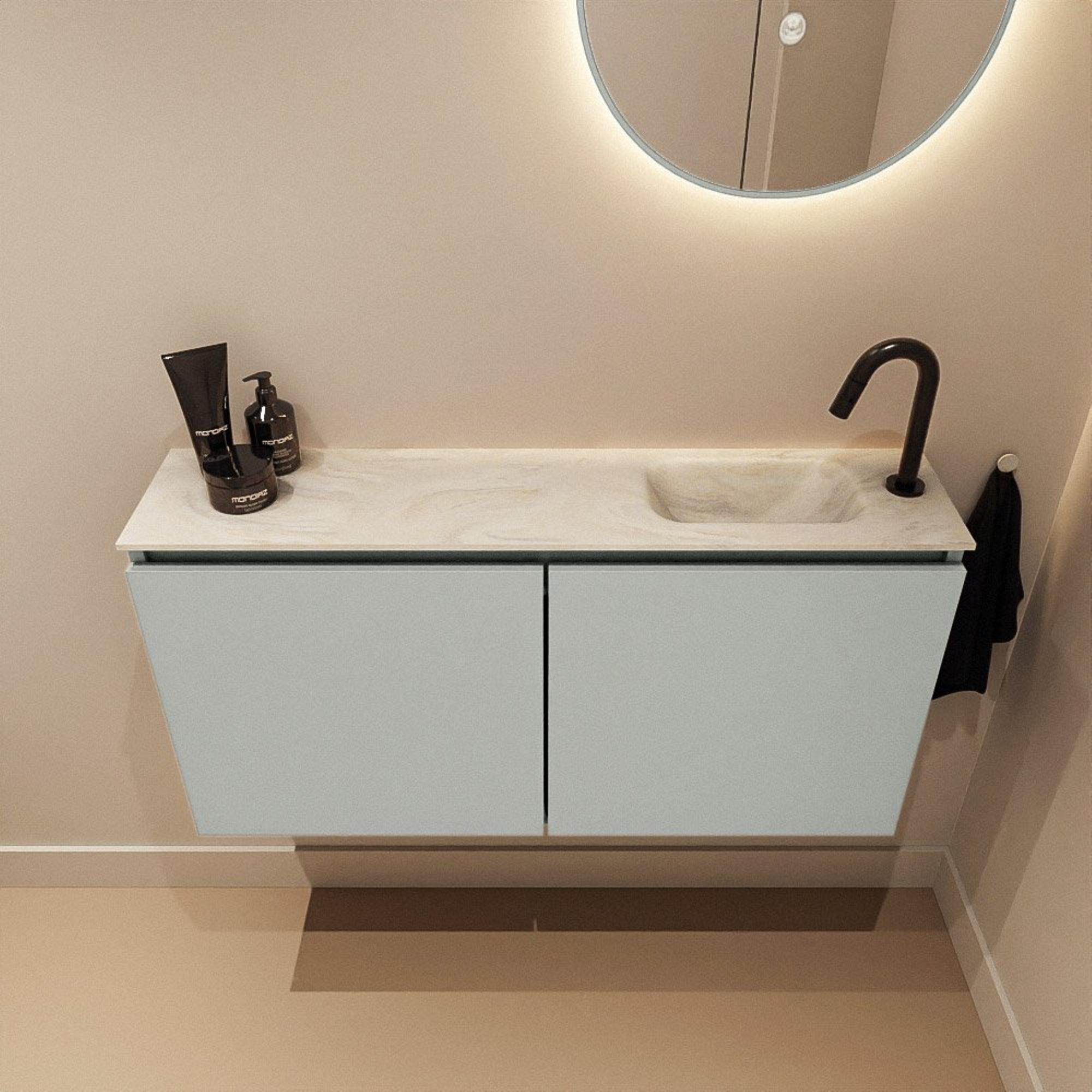MONDIAZ TURE-DLUX meuble de WC 100 cm Greey. Lavabo EDEN Ostra position à droite. Avec 1 trou de robinet.
