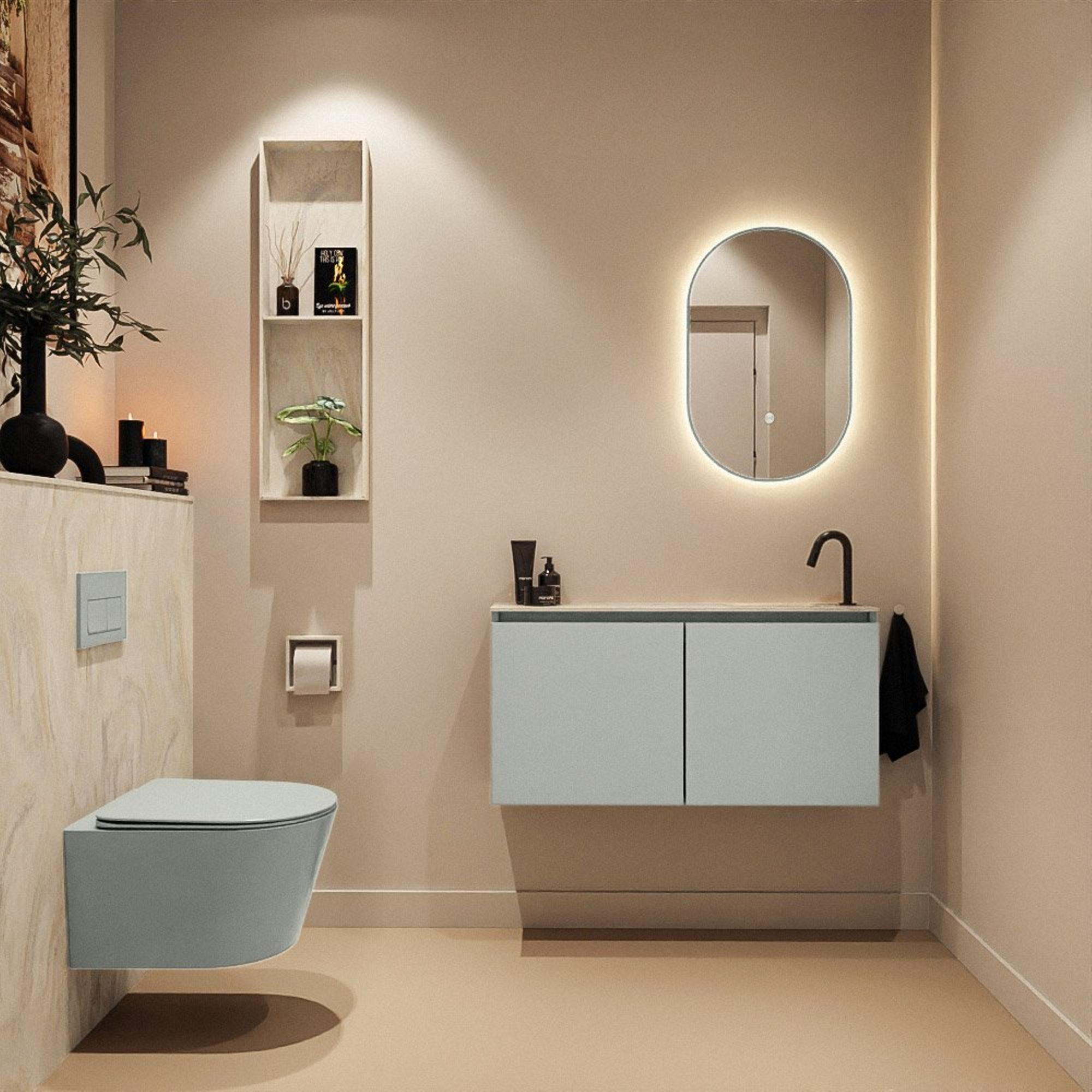 La couleur Greey du meuble s’accorde avec les nuances de vert tendance actuelles et donne immédiatement du caractère à vos toilettes ou à votre salle de bains. En combinaison avec le lavabo EDEN de finition Ostra de couleur crème, avec son effet légèrement marbré, on obtient un look chic et néanmoins apaisant. La finition sans poignées souligne le caractère minimaliste et moderne et évite toute agitation visuelle sur les façades. Ce meuble se combine ainsi sans effort avec des robinets et accessoires noirs, couleur chrome ou en métal brossé. Que vous recherchiez une atmosphère d’hôtel épurée ou plutôt une ambiance spa naturelle, cette combinaison constitue un point de départ élégant et intemporel.