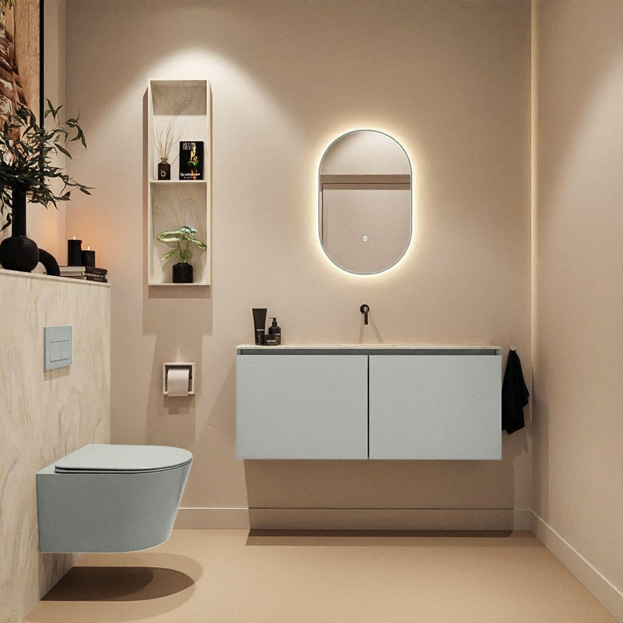 Le meuble bas de couleur Greey apporte un accent moderne et raffiné : une teinte vert-gris contemporaine qui se marie facilement avec des carreaux blancs, un aspect béton ou des tons de bois chauds. Le plan de lavabo crème contrastant ajoute une touche douce et luxueuse et rend l’ensemble un peu plus chaleureux que le blanc pur. Ensemble, ces couleurs créent un ensemble chic et élégant qui ne lasse pas facilement et s’intègre parfaitement dans un WC moderne ou une salle de bains design. Grâce à la façade sans poignées, la forme reste épurée et calme, sans interruption. Cela rend le meuble non seulement agréable à regarder, mais aussi intemporel, afin que vous puissiez en profiter pendant des années sans qu’il ne paraisse démodé.