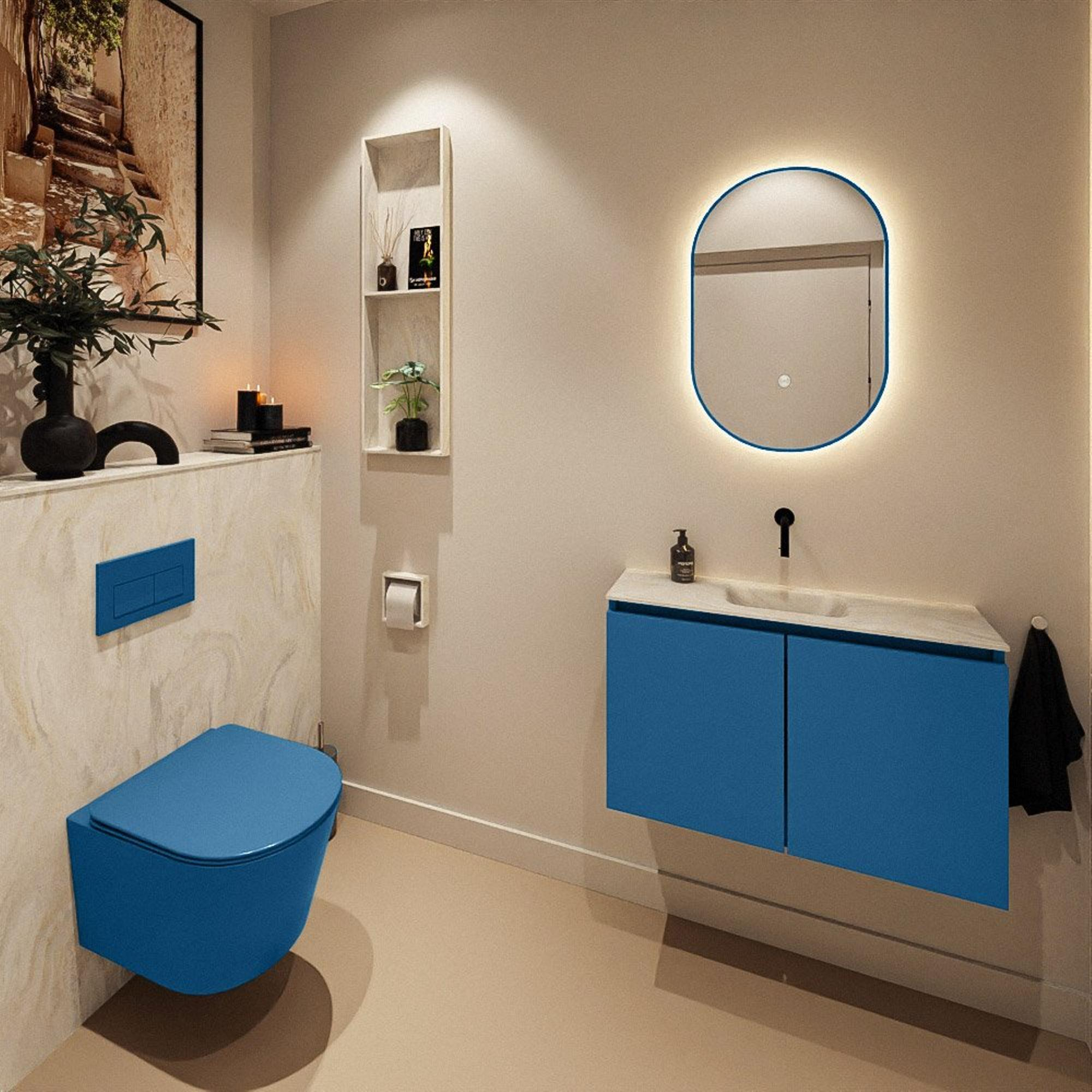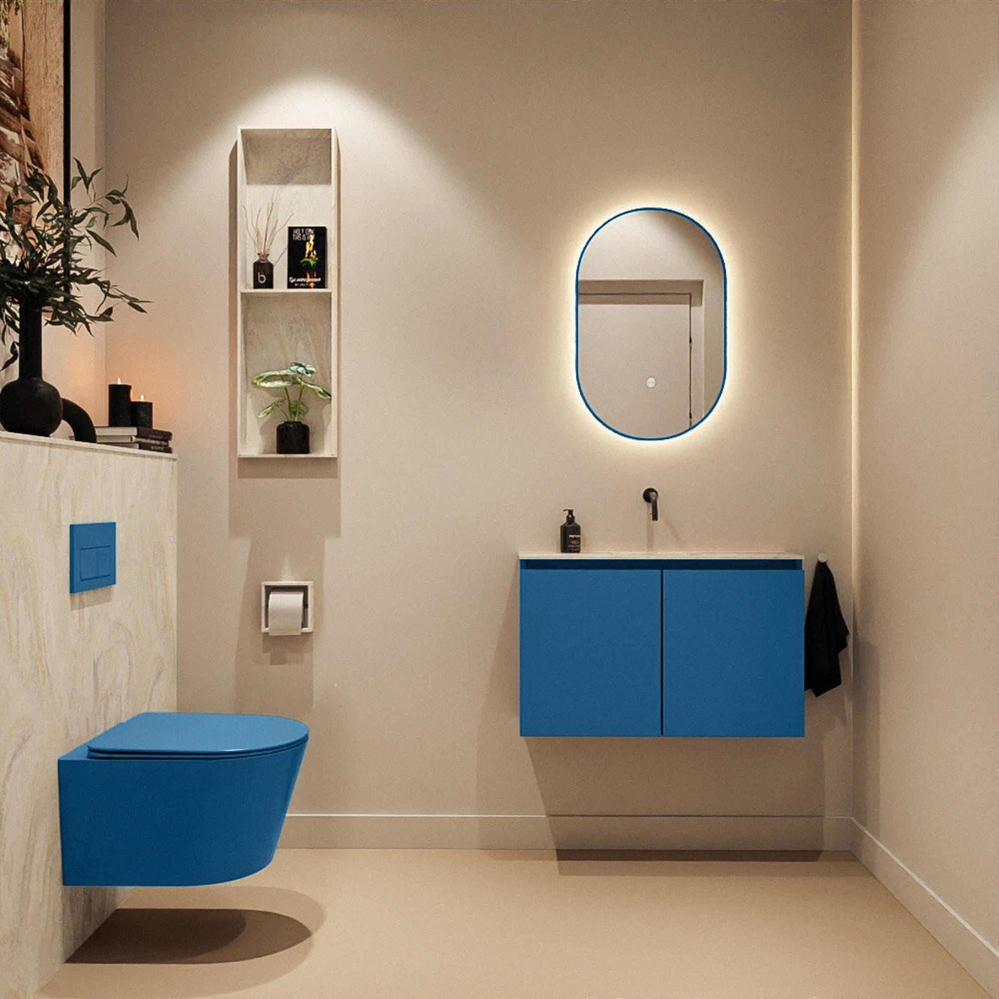 La couleur Jeans du meuble apporte une touche contemporaine et chaleureuse à vos toilettes ou à votre salle de bains. La façade bleue se combine à merveille avec des carreaux clairs, des tons bois et des accents noirs ou laiton, et s'accorde parfaitement avec les salles de bains modernes et design. Le lavabo Eden crème dans la teinte Ostra ajoute un effet raffiné, presque marbré, sans la fragilité de la pierre naturelle véritable. Comme le lavabo est réalisé sans trou de robinet, un beau robinet mural est parfaitement mis en valeur et l'apparence du plan reste calme et luxueuse. Cette combinaison fait du meuble un véritable point de mire, même dans un petit espace, et vous aide à créer un look homogène et haut de gamme.