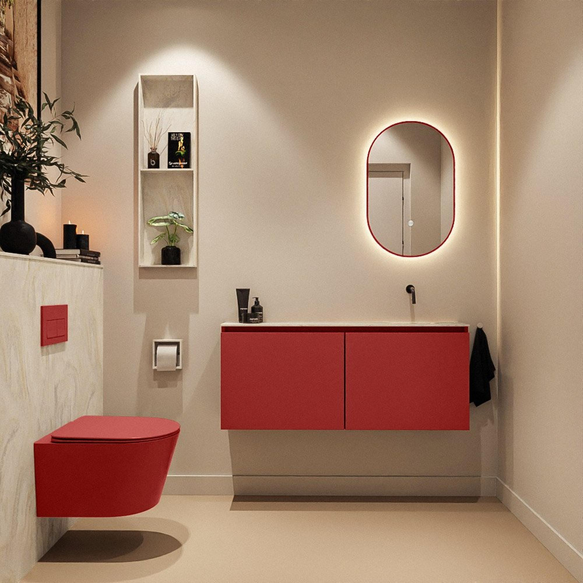 La combinaison du meuble épuré sans poignées et de la teinte chaleureuse Fire confère immédiatement à vos toilettes une allure haut de gamme et design. Le meuble peu profond de 23 cm de profondeur paraît fin et léger, tandis que la largeur de 120 cm crée un ensemble généreux le long du mur. Les lignes modernes et droites s'harmonisent parfaitement avec un style de salle de bains minimaliste ou d'inspiration hôtelière. La teinte Fire s'épanouit particulièrement bien à côté de carreaux neutres en blanc, gris ou beige, mais forme également un contraste puissant avec des murs plus foncés. Vous créez ainsi facilement un véritable point de mire dans un espace souvent un peu oublié, sans devoir renoncer à la praticité.
