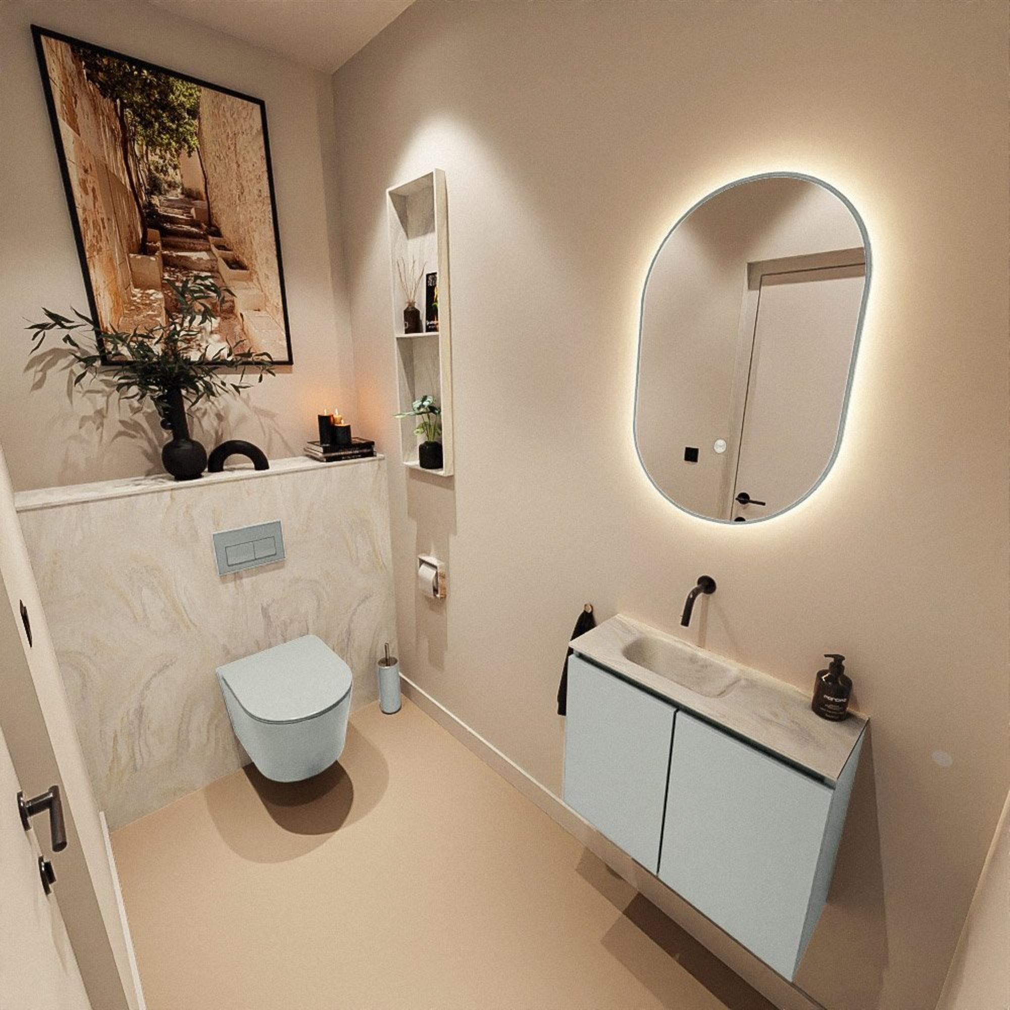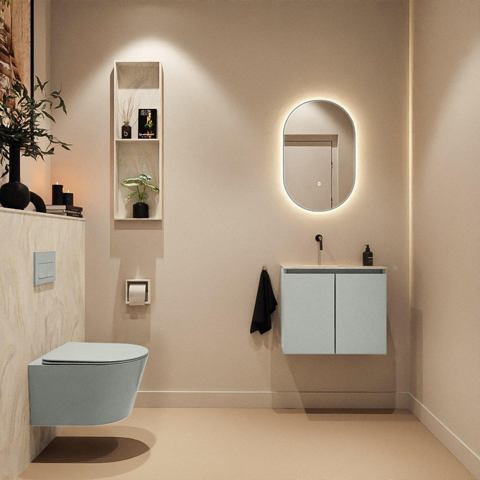 Avec des dimensions de 60x23x50 cm, ce meuble peu profond est spécialement conçu pour les toilettes compactes et les salles de bains étroites. La faible profondeur permet de passer facilement devant le meuble sans qu’il gêne, tout en disposant d’un lavabo complet. Le bassin est positionné à gauche, ce qui offre un espace de pose supplémentaire de l’autre côté, par exemple pour un distributeur de savon ou un accessoire décoratif. Comme il n’y a pas de trou de robinet, vous combinez ce meuble avec un mitigeur mural, ce qui donne au plan un aspect encore plus calme et spacieux visuellement. Vous exploitez ainsi au maximum l’espace disponible, sans faire de concessions sur le confort et la facilité d’utilisation.