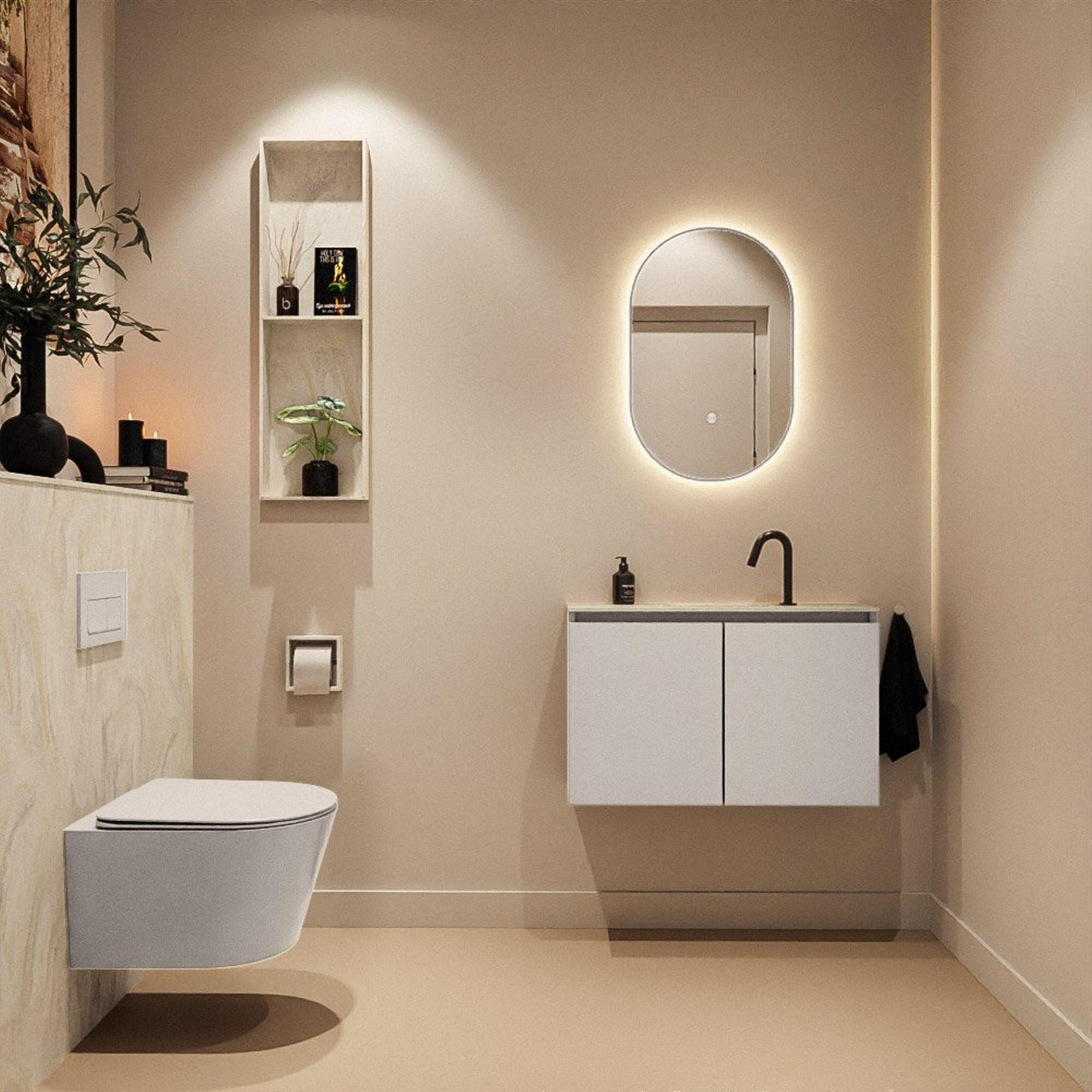 La couleur lin du meuble en MDF s’accorde parfaitement avec la couleur crème du plan vasque en solid surface. La version Ostra du lavabo présente un léger effet marbré, ce qui crée une allure luxueuse, digne d’un spa, sans être criarde. Les façades sans poignées renforcent le caractère épuré et moderne et confèrent un look calme et minimaliste. Grâce à ces teintes neutres et chaleureuses, vous pouvez facilement combiner ce meuble avec des robinets et accessoires noirs, chromés ou en métal brossé, afin d’aligner précisément le style de vos toilettes sur le reste de votre intérieur.
