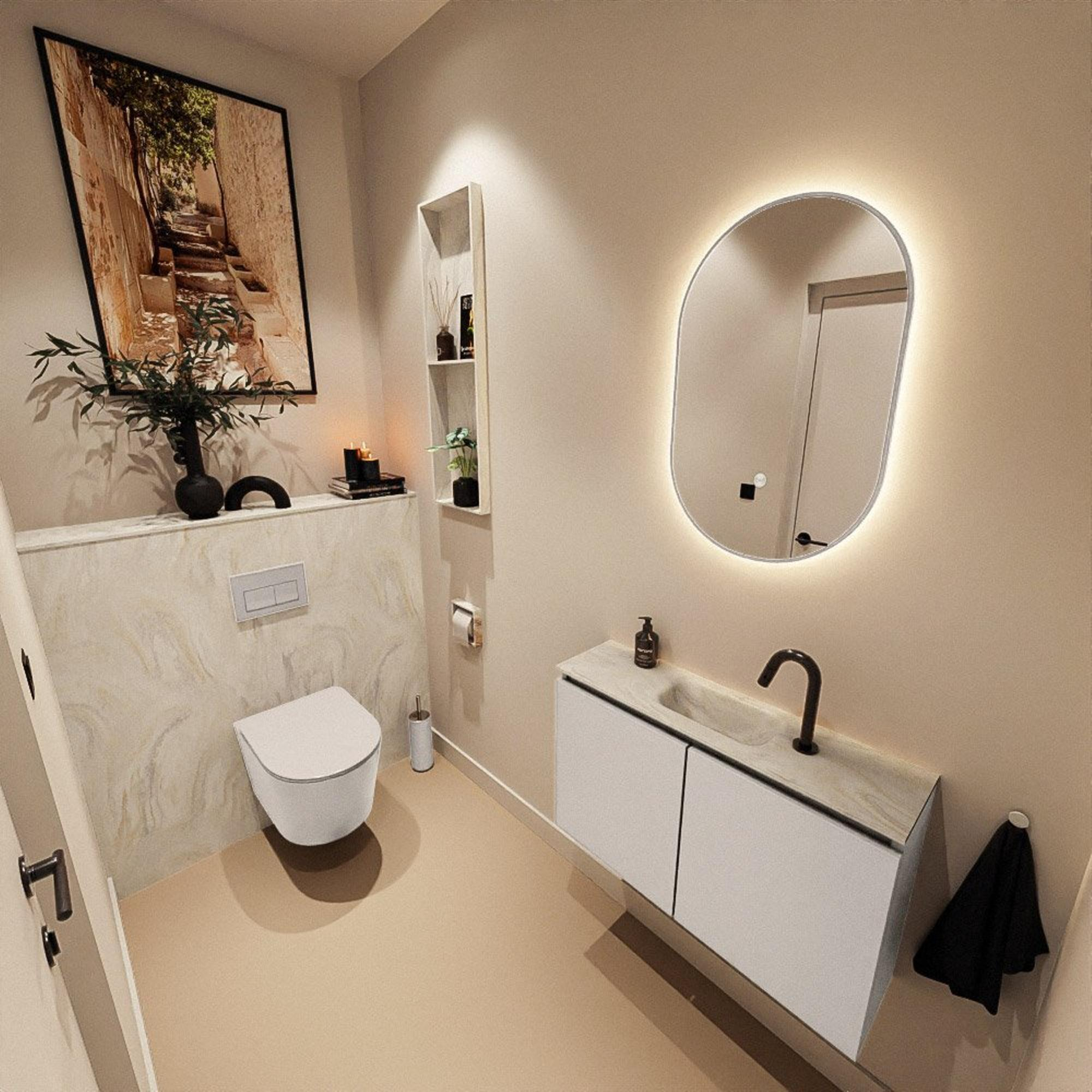 Vous recherchez un meuble élégant et peu encombrant pour une petite salle de bains ou un espace toilettes, sans faire de compromis sur l’apparence et le confort ? Ce meuble WC compact avec lavabo assorti combine des dimensions fines avec un look étonnamment luxueux. La chaude couleur lin du meuble et la surface subtilement marbrée du plan vasque confèrent immédiatement à même le plus petit espace une ambiance haut de gamme et apaisante. Grâce à sa faible profondeur, c’est un choix judicieux pour les couloirs étroits, les toilettes compactes ou une deuxième salle de bains, tout en vous offrant un véritable petit lavabo et un espace de rangement pratique. Avec la position du robinet au milieu, vous créez un aspect symétrique et calme qui s’intègre facilement dans un style d’habitat moderne, scandinave ou intemporel.