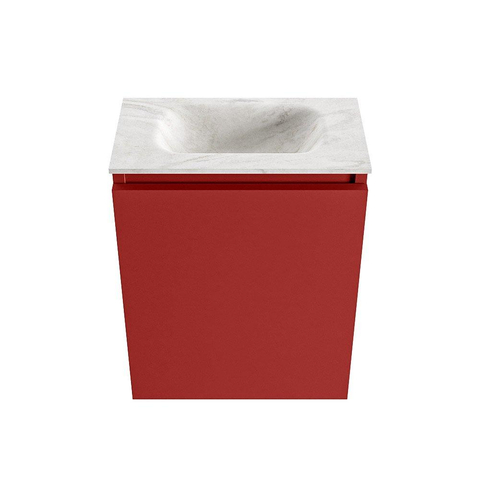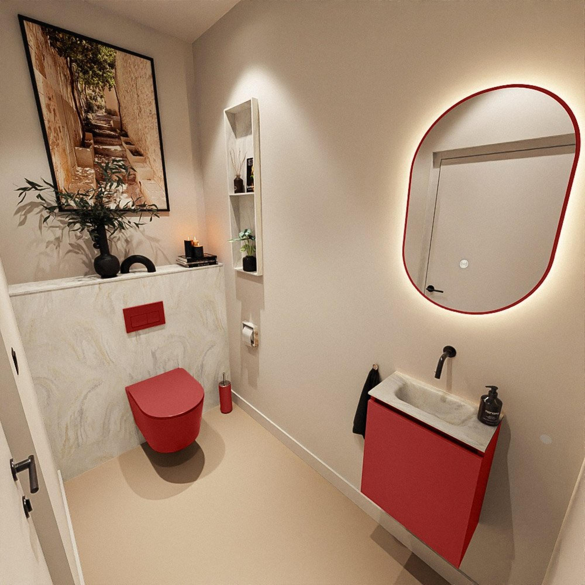 La couleur rouge profond Fire du meuble donne à vos toilettes un caractère affirmé et moderne. En combinaison avec le lavabo crème EDEN Ostra, il en résulte un contraste élégant qui s'intègre parfaitement dans les intérieurs orientés design, mais trouve également sa place dans un WC de style hôtel chic et chaleureux. Le panneau frontal sans poignée crée une apparence minimaliste et rend l'ensemble visuellement reposant, ce qui est particulièrement appréciable dans les petits espaces. En combinant ce meuble avec des robinets et des accessoires noirs mats, chromés ou en laiton, vous imprimez facilement votre propre signature à la pièce et harmonisez l'ensemble avec le style du reste de votre salle de bains.