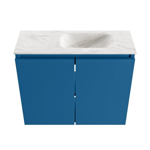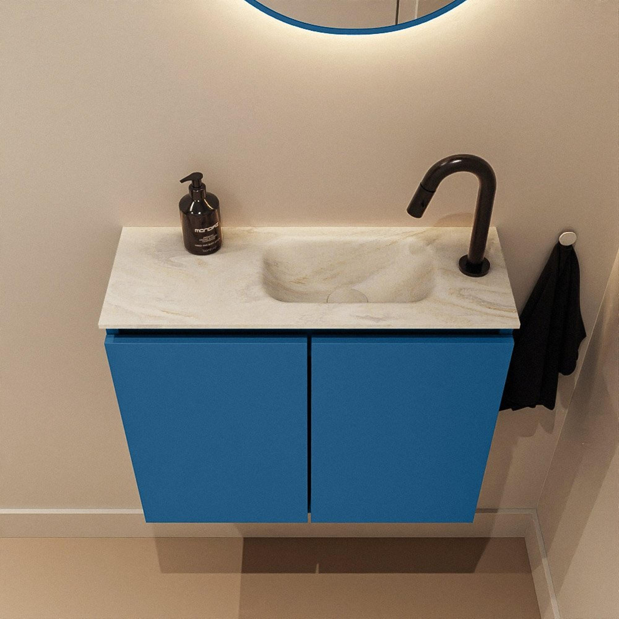 Si vous recherchez un meuble élégant et pratique pour vos toilettes ou une petite salle de bains, alors ce modèle compact est un choix judicieux. Grâce à sa faible profondeur, il dépasse à peine dans la pièce, ce qui laisse votre ligne de passage dégagée et donne une impression d’espace. La combinaison d’une couleur de meuble moderne bleue et d’un lavabo crème apaisant offre un aspect contemporain mais néanmoins intemporel, qui s’intègre parfaitement aux intérieurs modernes, scandinaves ou industriels. Avec le bassin à droite et un seul trou de robinet, ce meuble est idéal si vous avez une configuration de préférence bien définie ou un espace limité à côté de la porte ou du mur. Le lavabo en solid surface est en outre très facile d’entretien, ce qui en fait une excellente solution si vous souhaitez des toilettes propres et hygiéniques sans trop de travail de nettoyage.