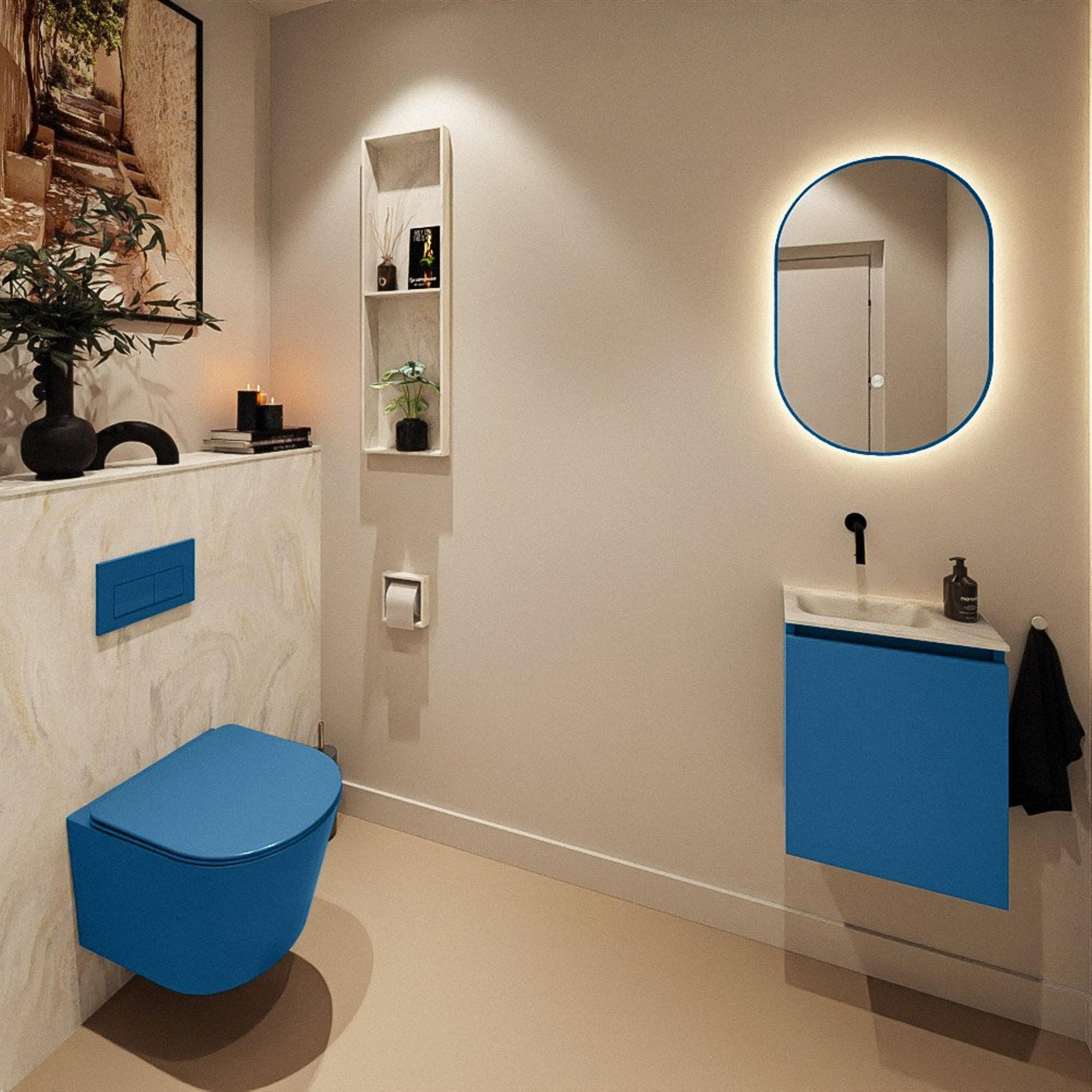 Vous recherchez un meuble de lavabo compact et moderne qui offre un peu plus d’allure que le blanc standard, tout en restant pratique à l’usage quotidien ? Alors ce meuble compact est un choix judicieux pour les toilettes, la petite salle de bains ou la chambre d’amis où chaque centimètre compte. La faible profondeur vous permet de vous déplacer aisément dans un espace étroit, tout en disposant d’une solution de lavage complète avec un lavabo solide et un espace de rangement pratique derrière la porte. Grâce à la couleur contemporaine bleue du meuble et au plan de toilette crème doux, on obtient un style élégant et apaisant qui se marie facilement avec des robinets et accessoires noirs, chromés ou en métal brossé. Ce meuble est particulièrement adapté si vous aimez le design moderne, les lignes épurées et un ensemble ordonné, sans faire de compromis sur le confort et la qualité.
