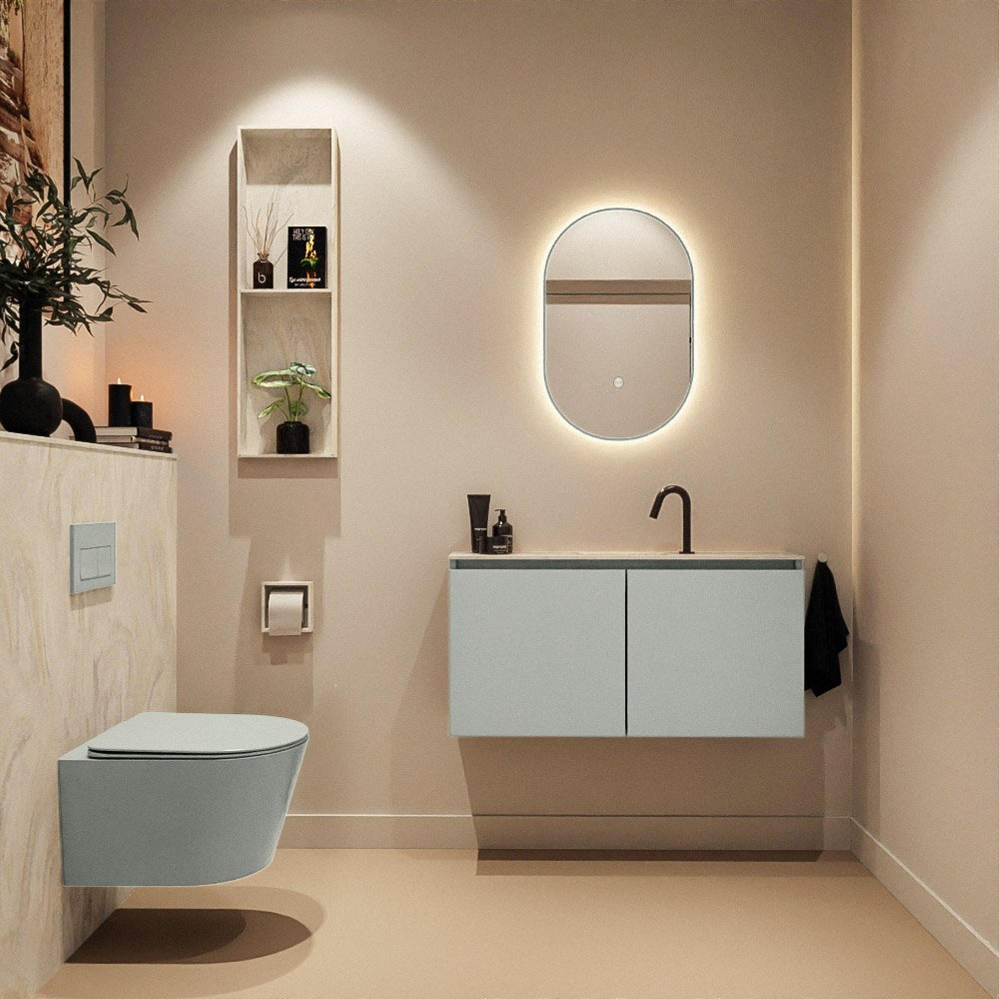Le meuble bas est réalisé dans la couleur contemporaine Greey, une teinte gris-vert moderne qui apporte chaleur et sérénité à votre intérieur. En combinaison avec le plan de toilette en solid surface couleur crème et la couleur Ostra du lavabo, on obtient un aspect doux et naturel qui se marie parfaitement avec des carreaux blancs, gris ou au contraire foncés. Ce mélange de couleurs offre une apparence luxueuse sans être criarde, donnant ainsi à la pièce une impression de grandeur et de clarté. Les lignes modernes et épurées s’accordent bien avec un style de salle de bains minimaliste, moderne ou scandinave. Choisissez un robinet assorti, par exemple en noir mat, en chrome ou en métal brossé pour parfaire le look et créer un ensemble harmonieux.