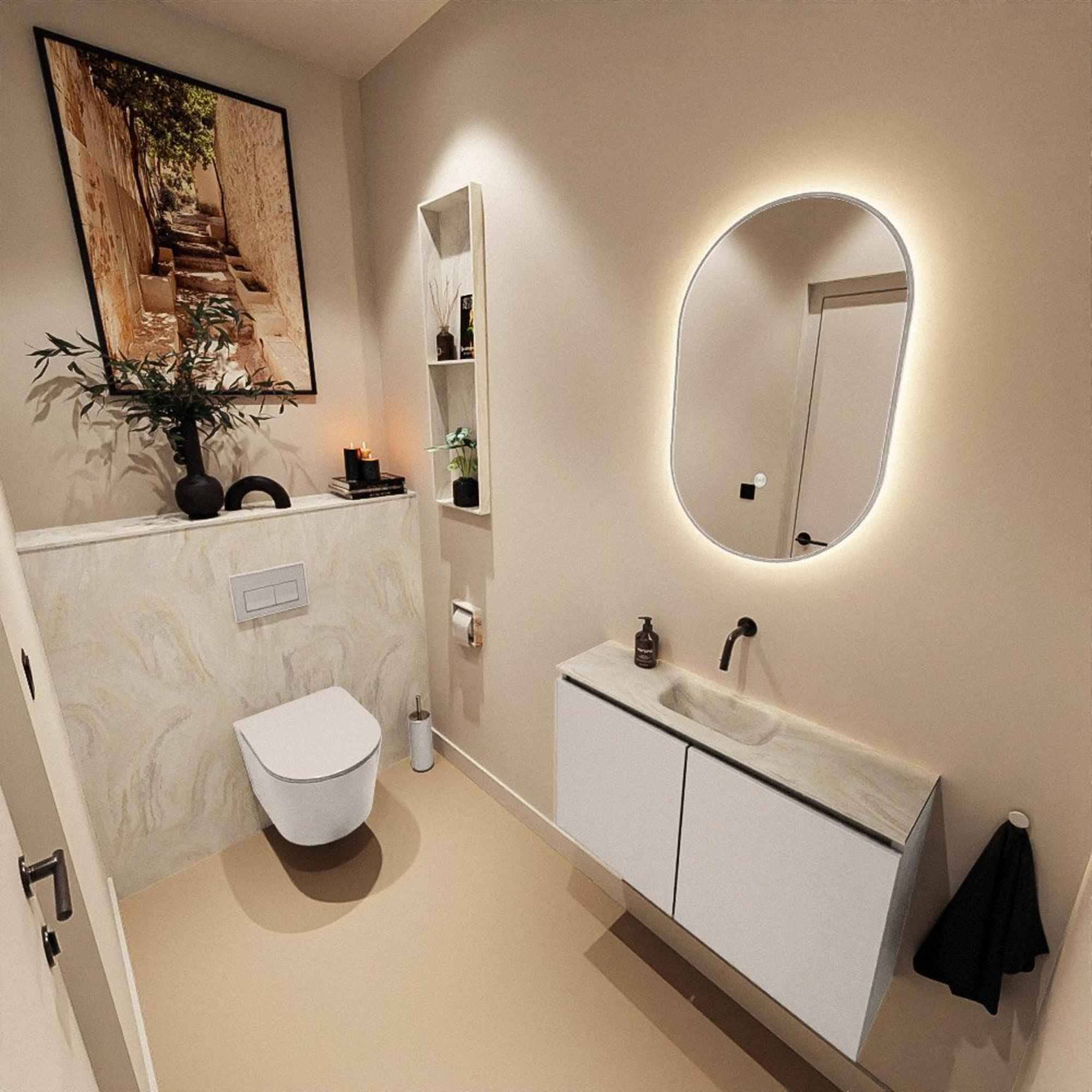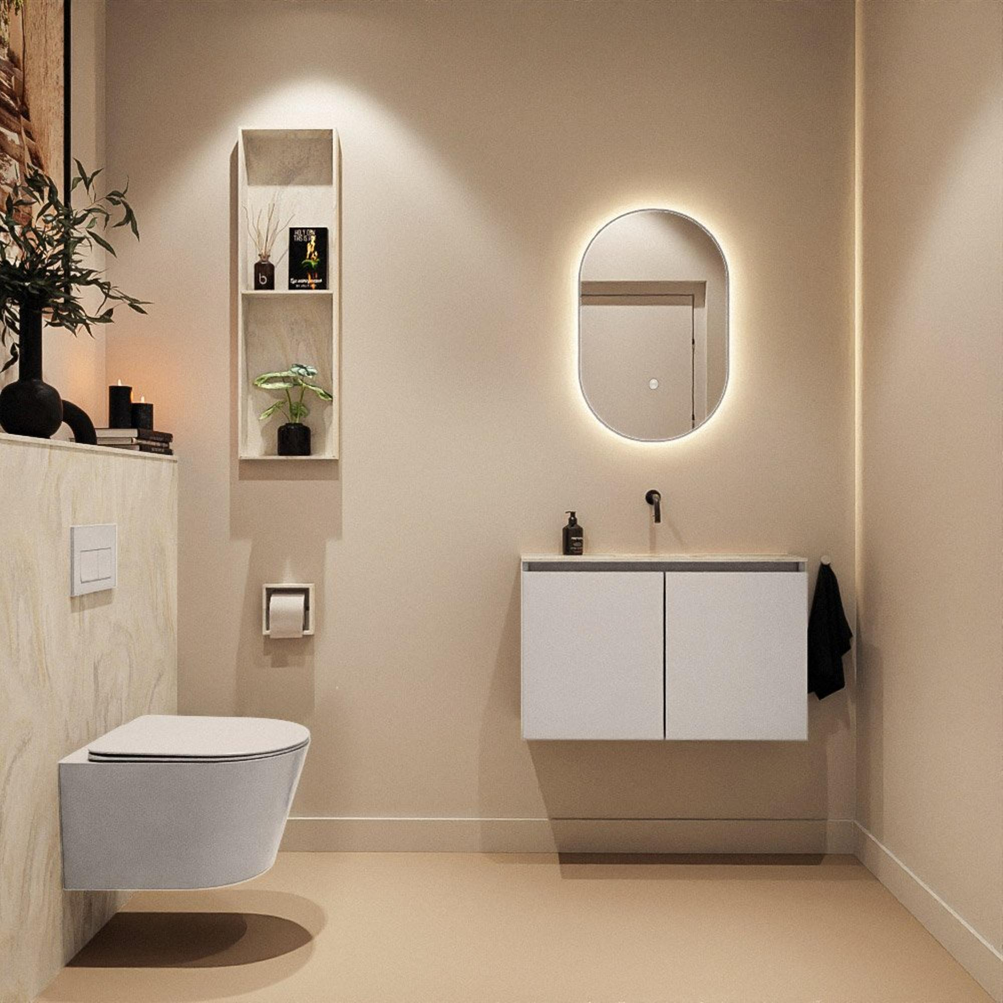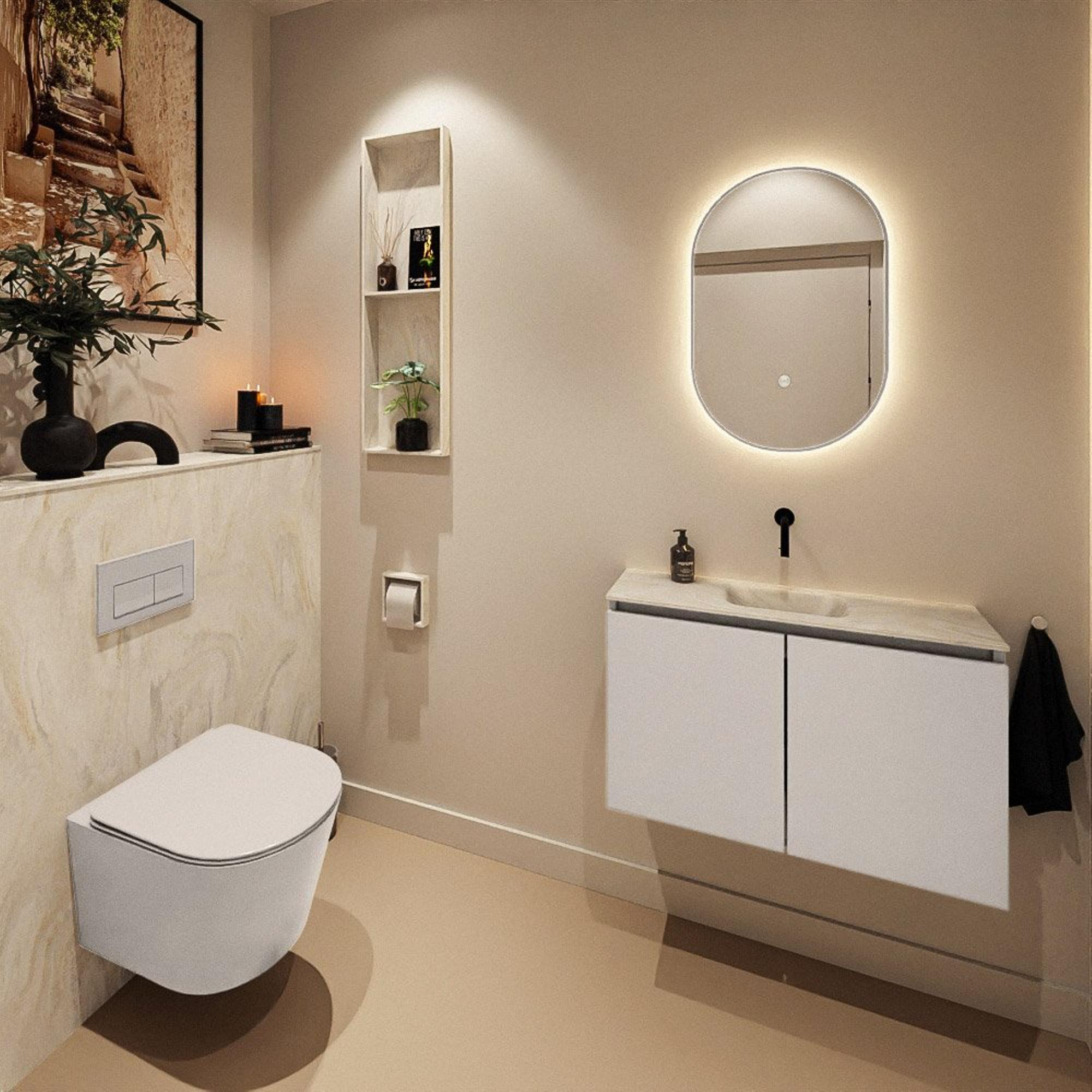 Si vous recherchez un meuble sobre et compact qui permet de créer une allure luxueuse même dans un petit espace de toilettes, alors ce meuble de toilette est un choix judicieux. Grâce à sa faible profondeur, il occupe à peine de place, tout en offrant un lavabo complet avec un confort de lavage suffisant pour se laver les mains. La combinaison du meuble dans une chaleureuse couleur lin et du plan vasque crème apaisant crée une apparence moderne et douce qui s’intègre à de nombreux styles d’intérieur : du style hôtel chic au minimalisme scandinave. Ce meuble s’exprime particulièrement bien dans des toilettes invités ou une petite salle de bains dans laquelle vous souhaitez conserver une ambiance lumineuse, aérée et ordonnée. Grâce à la finition sans poignées, l’ensemble paraît encore plus épuré et apaisant, et les matériaux solides en font un choix durable pour un usage quotidien.