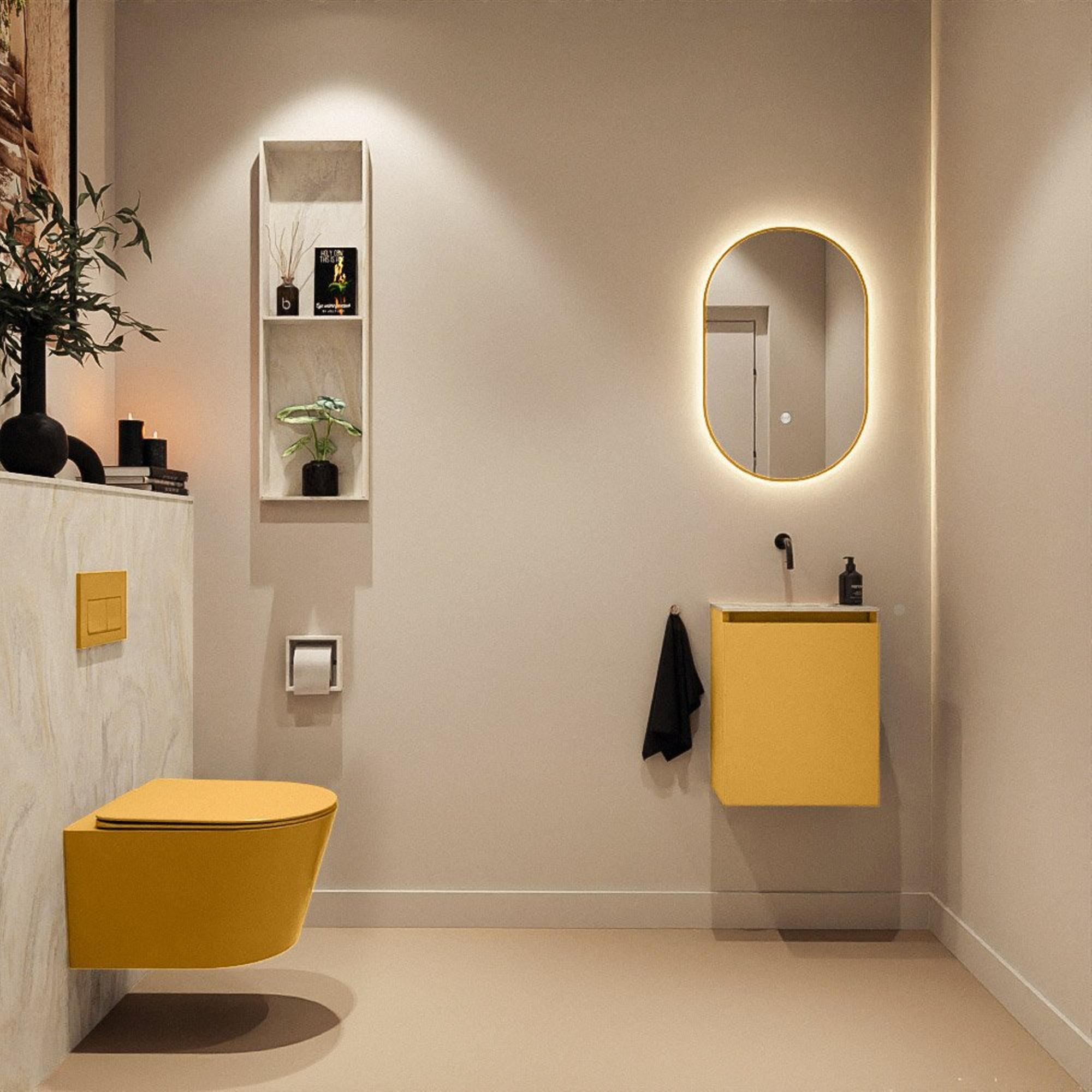 Le meuble de couleur Ocher donne immédiatement du caractère à vos toilettes. Sa teinte chaude légèrement orangée forme un beau contraste avec des murs et carreaux neutres et crée une ambiance luxueuse digne d’un hôtel. Grâce aux façades planes et modernes ainsi qu’à l’exécution sans poignées, ce meuble s’intègre parfaitement dans un intérieur épuré, mais trouve également bien sa place dans un aménagement plus ludique ou coloré. Associez la couleur ocre à des détails noirs pour un look affirmé, ou à des finitions laiton et des tons bois pour un style doux et naturel. Vous transformez ainsi un espace souvent oublié en véritable carte de visite de votre maison.