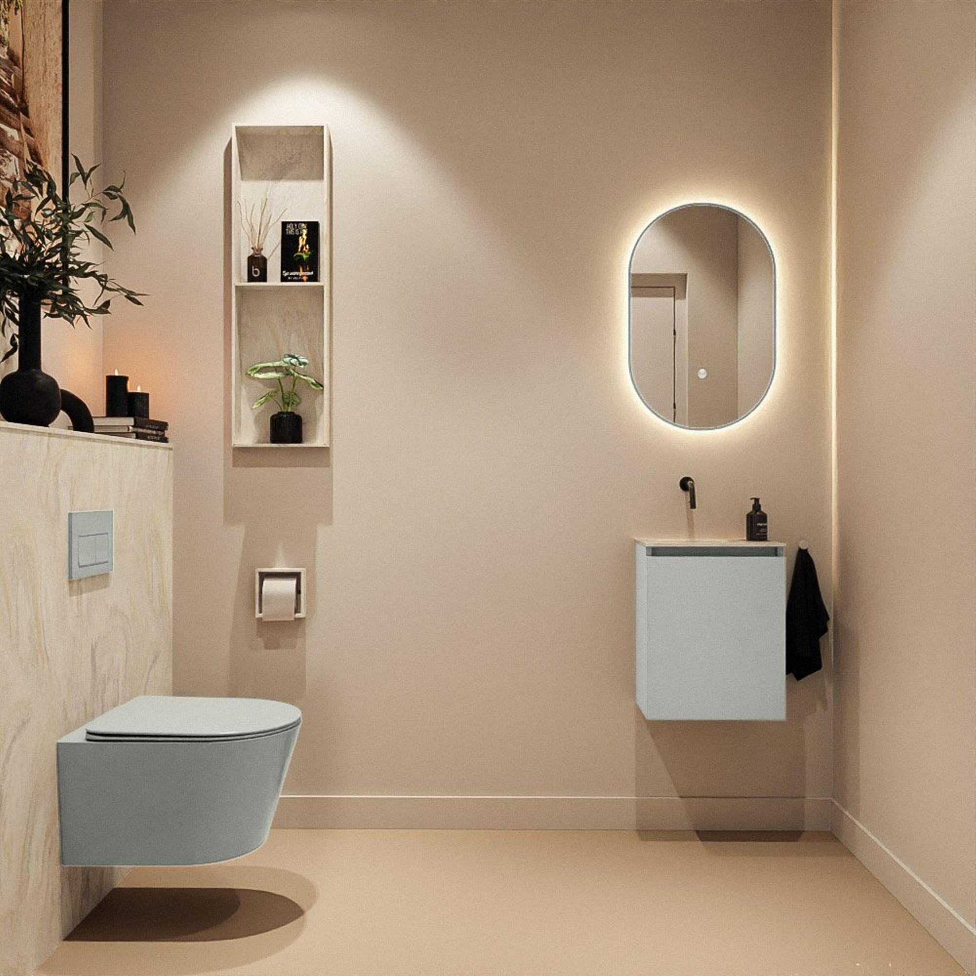 La couleur moderne Greey – une teinte vert gris contemporaine – donne immédiatement du caractère à ce meuble. En combinaison avec le lavabo en Solid Surface de couleur crème, un contraste doux se crée, qui dégage un aspect luxueux sans être criard. Cette combinaison se marie facilement avec des accessoires noirs mats, chromés ou en métal brossé, mais aussi avec des matériaux naturels comme le bois ou des carreaux clairs. La façade sans poignée renforce l'apparence moderne et épurée et permet au meuble de s'intégrer harmonieusement dans l'ensemble de votre espace WC ou salle de bains. Il forme ainsi un accent de design subtil qui ne domine pas, mais fait bel et bien la différence dans l'expérience globale.