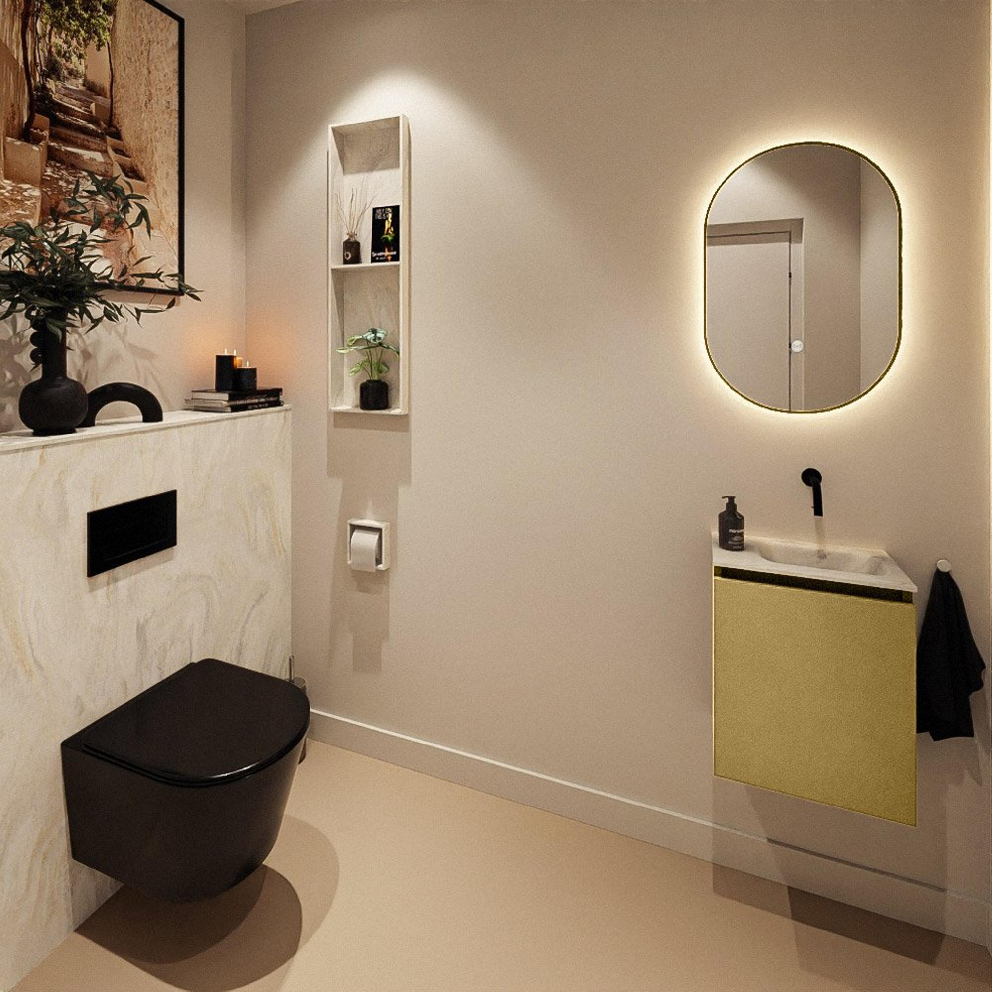 Le meuble dans la couleur Oro offre un aspect chaleureux, doré, qui ajoute immédiatement une touche de luxe à vos toilettes. En combinaison avec le lavabo Eden de couleur crème, il forme un ensemble chic qui s’intègre parfaitement dans les salles de bains modernes dignes d’un hôtel. Les teintes calmes et douces se combinent très bien avec des cuvettes de toilettes blanches, des robinets noirs mats ou des accessoires dorés, ce qui vous permet de créer facilement un intérieur harmonieux. Les façades sans poignées soulignent le design épuré et offrent un aspect apaisant, ce qui fait une grande différence surtout dans les petits espaces. Votre espace toilettes paraît ainsi immédiatement plus haut de gamme et aménagé avec davantage de soin.