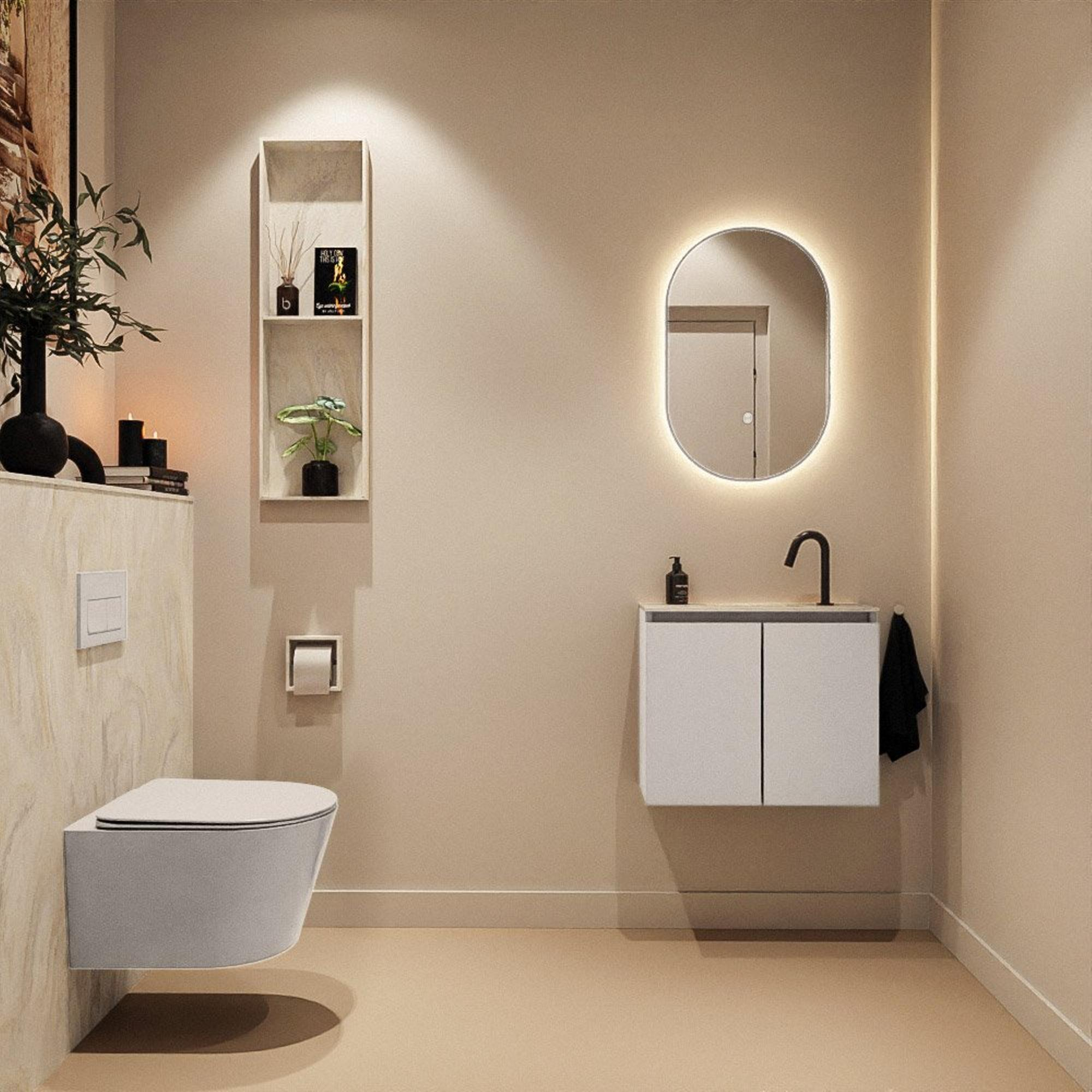 Avec une largeur de 60 cm et une profondeur de seulement 23 cm, ce meuble WC est parfait pour les toilettes étroites et les petites salles de bains. La conception peu profonde limite l’emprise au sol, ce qui vous permet de vous déplacer aisément sans heurter le meuble. Le lavabo est positionné au centre, de sorte que vous vous tenez toujours bien en face du robinet et que le jet d’eau tombe correctement dans la cuve. La hauteur du meuble est adaptée à un usage quotidien, afin que les adultes comme les enfants puissent l’utiliser confortablement. Vous exploitez ainsi chaque centimètre de manière optimale, sans que la pièce paraisse chargée ou encombrée. Cela rend le meuble particulièrement adapté aux rénovations où les conduites existantes restent en place et où vous souhaitez malgré tout une solution moderne et épurée.