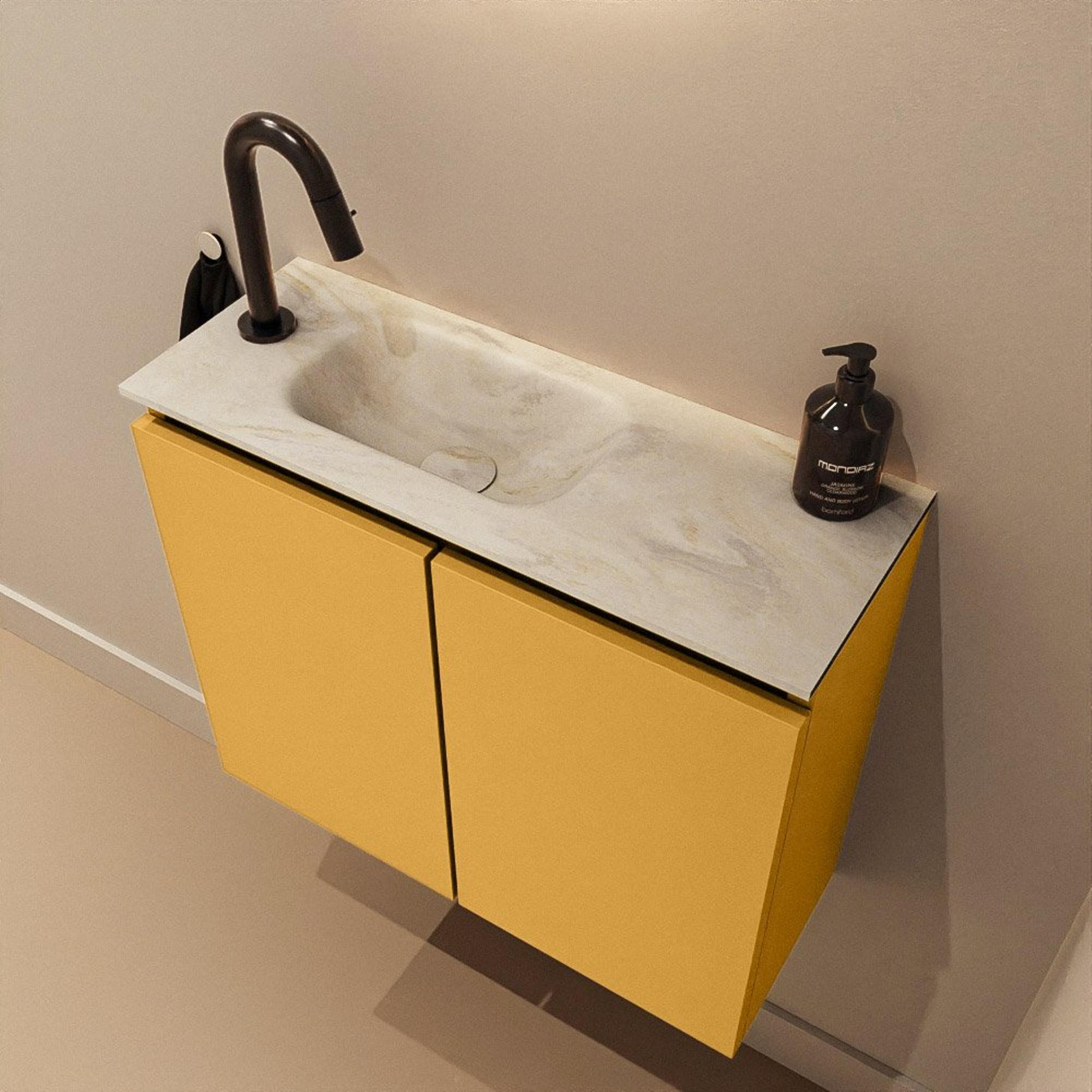 Jeu de couleurs élégant : Ocher avec lavabo couleur crème