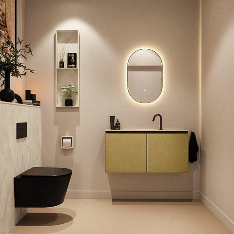 Le meuble bas doré en Oro constitue un véritable accroche-regard dans la pièce, sans être criard. Les façades sans poignées offrent un aspect minimaliste et épuré, où tout est axé sur des lignes nettes et des détails raffinés. Combinée avec la vasque de couleur crème, cette configuration crée un contraste chic qui rappelle les salles de bains d’hôtels haut de gamme. Ce meuble est donc particulièrement adapté comme pièce maîtresse dans des toilettes modernes pour invités ou une salle de bains compacte où vous souhaitez malgré tout faire une déclaration. La composition symétrique avec la cuve au centre donne une impression de calme et d’équilibre, ce qui fait paraître l’espace plus grand et plus ordonné.