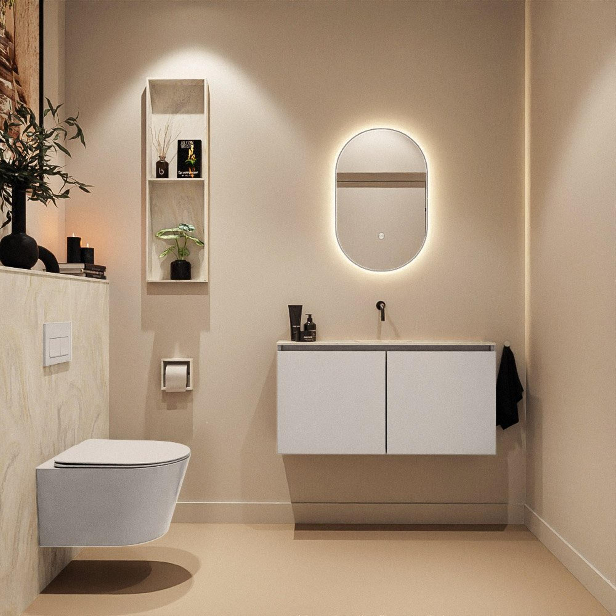 Vous recherchez un meuble WC élégant et pratique qui prend peu de place, mais qui paraît généreux et est agréable à utiliser ? Alors cette solution moderne avec meuble bas peu profond et lavabo assorti est un choix judicieux. Grâce à la faible profondeur, ce meuble s’intègre parfaitement dans un espace WC ou une petite salle de bains, tandis que la largeur généreuse de 100 cm crée une apparence murale calme et luxueuse. La teinte Linen claire et le plan de lavabo crème créent ensemble une atmosphère chaleureuse et contemporaine qui se marie bien aussi bien avec des tons naturels doux qu’avec un sanitaire noir épuré. Idéal si vous aimez un look minimaliste et ordonné sans poignées visibles et sans détails superflus. Les matériaux solides et la conception bien pensée rendent ce meuble particulièrement adapté à un usage quotidien par toute la famille ou dans un WC d’invités où vous souhaitez juste un peu plus de cachet.