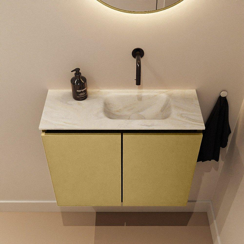 La couleur Oro donne au meuble une apparence chaleureuse et luxueuse qui s’intègre parfaitement dans les salles de bains modernes, hôtel chic ou design. La façade sans poignée offre un aspect épuré et minimaliste sans interruption, ce qui permet à la teinte dorée de vraiment ressortir. Combinez ce meuble avec des robinets et accessoires noirs, dorés ou en laiton brossé pour créer votre propre style. Le lavabo EDEN crème forme un contraste doux avec le doré, ce qui donne un ensemble raffiné sans être criard. Vous créez ainsi avec un seul meuble compact un véritable élément phare dans vos toilettes.