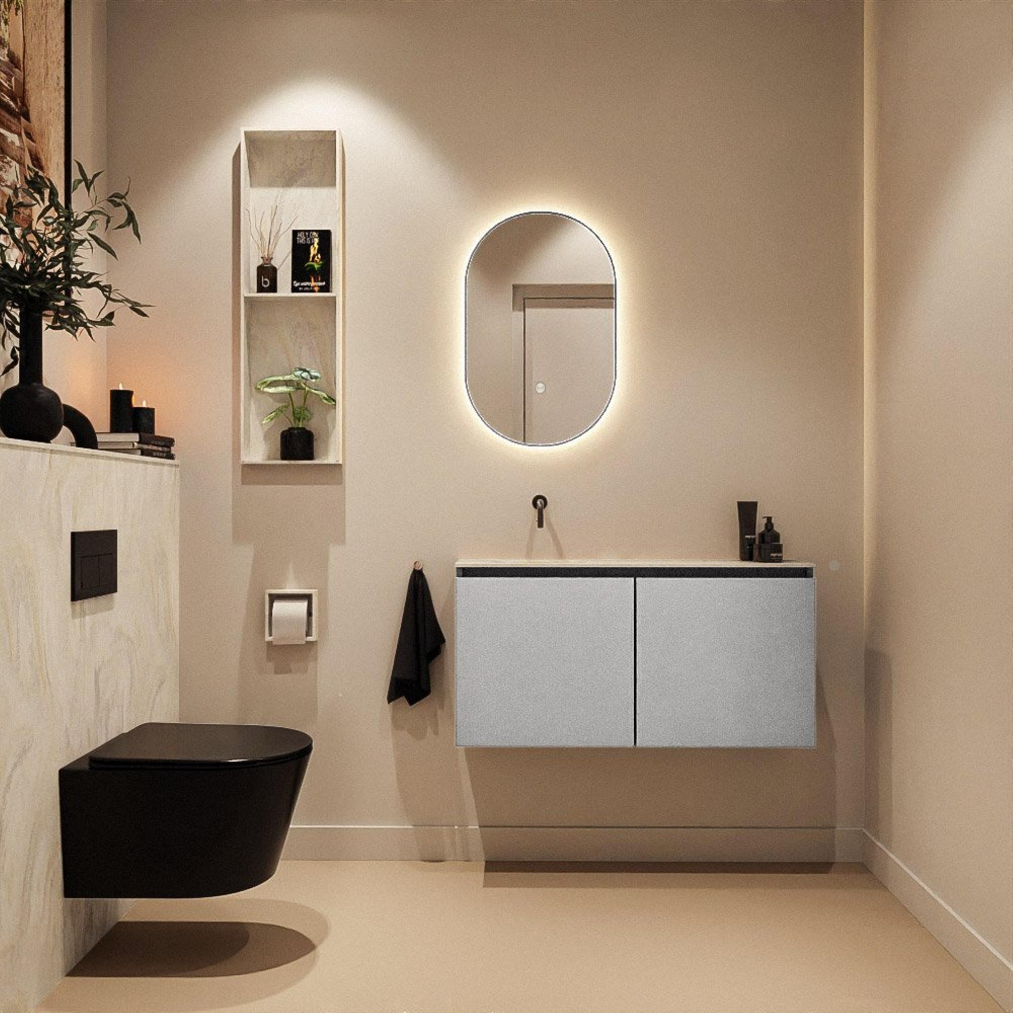 La teinte grise moderne Plata, combinée au design sans poignées, confère à vos toilettes une apparence calme et haut de gamme. Pas de poignées saillantes qui créent de la confusion visuelle, mais une façade épurée qui forme un tout avec le reste du meuble. Les deux portes s’ouvrent en douceur et silencieusement grâce aux charnières à fermeture amortie, de sorte que votre meuble se ferme toujours doucement et de manière contrôlée – agréable à l’usage et meilleur pour la longévité. La combinaison de couleurs apaisante du meuble gris et du lavabo en solid surface crème s’accorde parfaitement avec des carreaux clairs comme foncés et reste suffisamment intemporelle pour convenir également à un futur relooking. Vous investissez ainsi dans un meuble que vous regarderez avec satisfaction pendant de nombreuses années.