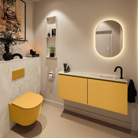 La combinaison des portes modernes sans poignées de couleur Ocher avec le plan vasque en solid surface crème donne immédiatement du caractère à vos toilettes. La teinte chaude s’accorde parfaitement avec des matériaux naturels tels que le bois, l’effet béton ou les carreaux aux couleurs douces, mais forme aussi un contraste intéressant avec des accents noirs ou des murs blancs. Grâce à la façade sans poignées, l’aspect reste calme et minimaliste : pas de poignées saillantes, mais une surface plane qui se prolonge joliment sur toute la largeur de 120 cm. Cela rend le meuble particulièrement adapté si vous souhaitez créer un style chic d’hôtel ou design, même dans une petite pièce. Combinez-le avec un robinet surélevé élancé, un miroir assorti et quelques accessoires subtils, et vos toilettes paraîtront immédiatement plus haut de gamme.
