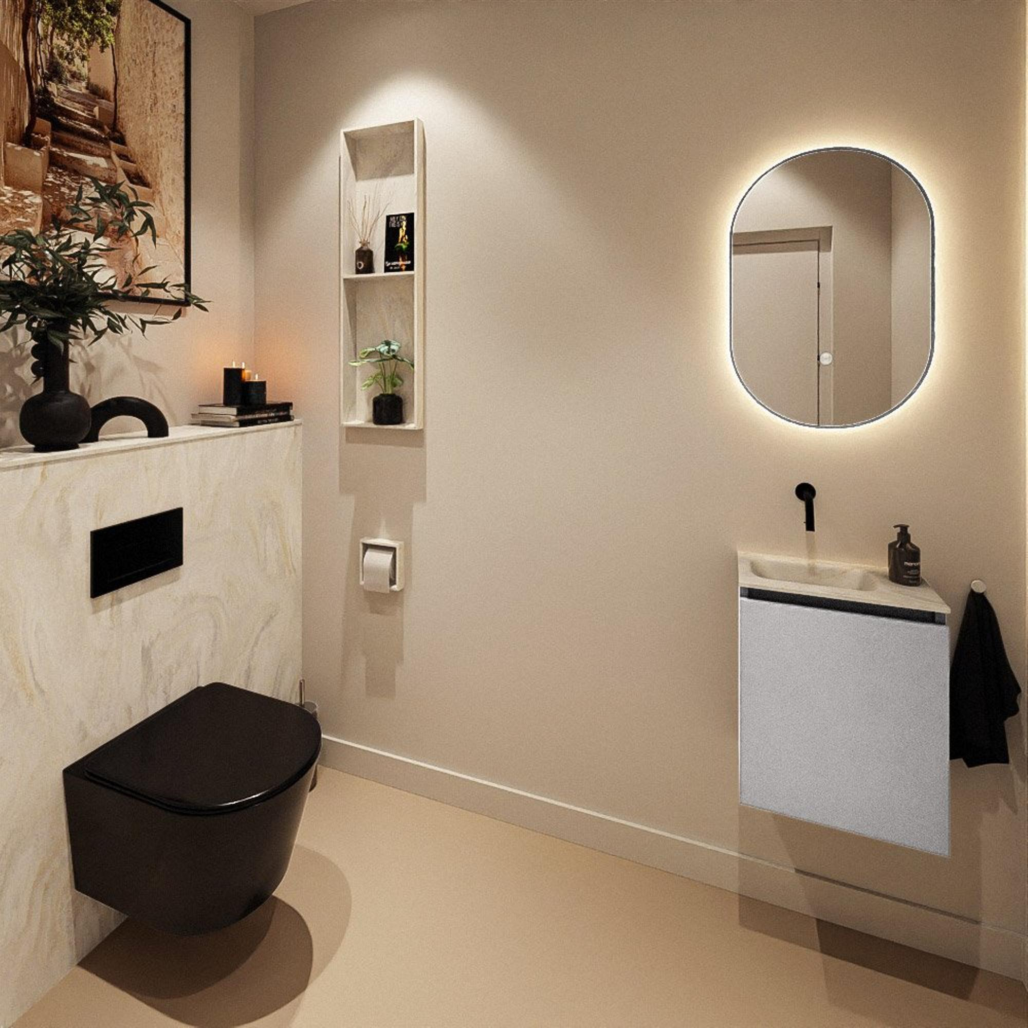 Avec une largeur de 40 cm et une profondeur réduite à seulement 23 cm, ce meuble est un choix judicieux pour les WC compacts et les couloirs étroits. Vous gagnez un espace de circulation précieux, tout en conservant suffisamment de surface et de cuve pour se laver les mains confortablement. Le lavabo intégré repose élégamment sur le meuble, de sorte que l’ensemble forme un tout homogène, sans parties saillantes contre lesquelles on pourrait se cogner. La porte dans la partie inférieure offre en outre de la place pour ranger discrètement les produits d’entretien ou des rouleaux de papier toilette supplémentaires. Vous gardez ainsi vos toilettes calmes, ordonnées et visuellement plus spacieuses.