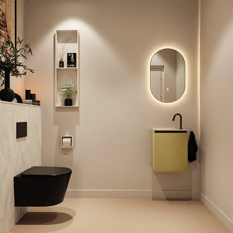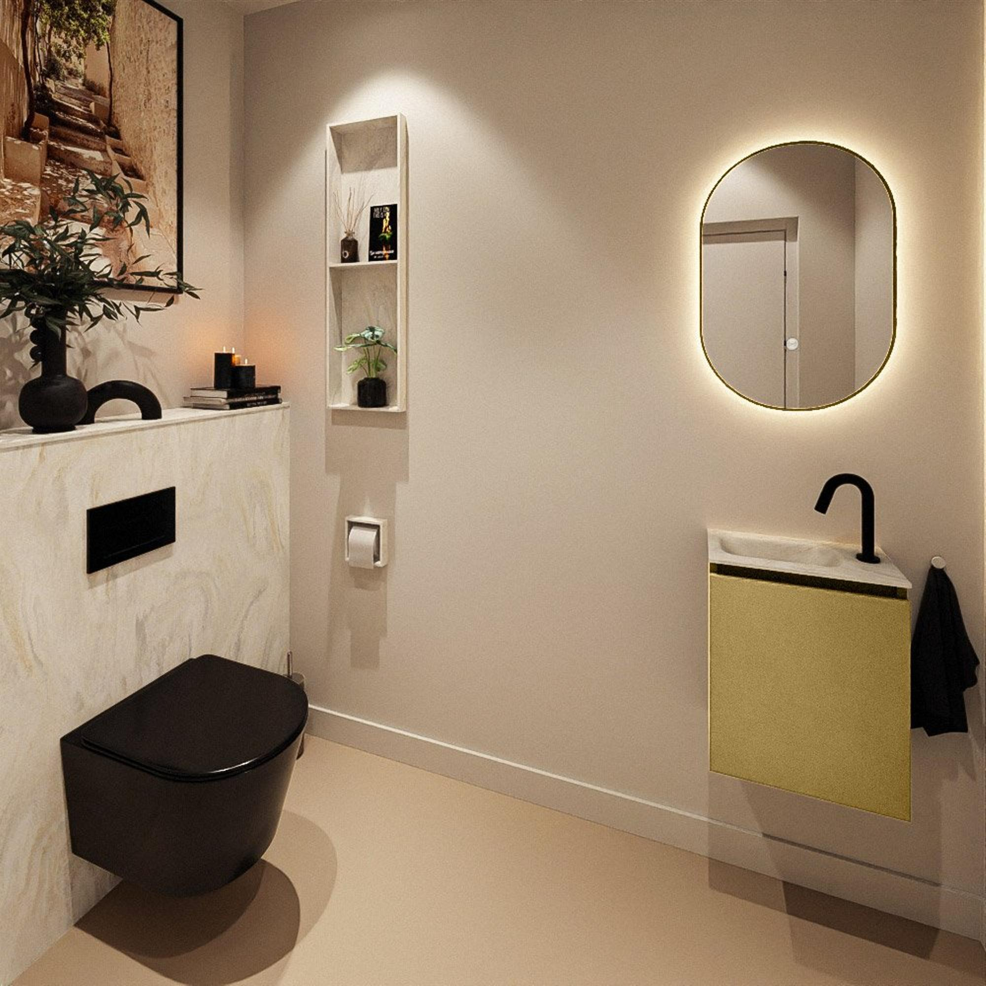 Avec ce meuble WC compact, vous créez en un rien de temps une allure luxueuse dans vos toilettes ou petite salle de bains, sans compromis sur la praticité. La combinaison du meuble épuré dans une teinte or chaude et du lavabo élégant en solid surface crème donne immédiatement à votre espace une atmosphère haut de gamme digne d’un hôtel. Grâce à sa faible profondeur, ce modèle est idéal pour les toilettes étroites, les niches ou un petit WC d’appoint, où chaque centimètre compte mais où vous souhaitez tout de même pouvoir vous laver les mains confortablement. La position du trou de robinet à gauche en fait en outre un choix astucieux si vous souhaitez, par exemple, garder libre un mur, une porte ou un radiateur à droite. Si vous recherchez un meuble moderne sans poignées qui combine style, gain de place et confort d’utilisation au quotidien, cet ensemble s’intègrera parfaitement dans votre intérieur.