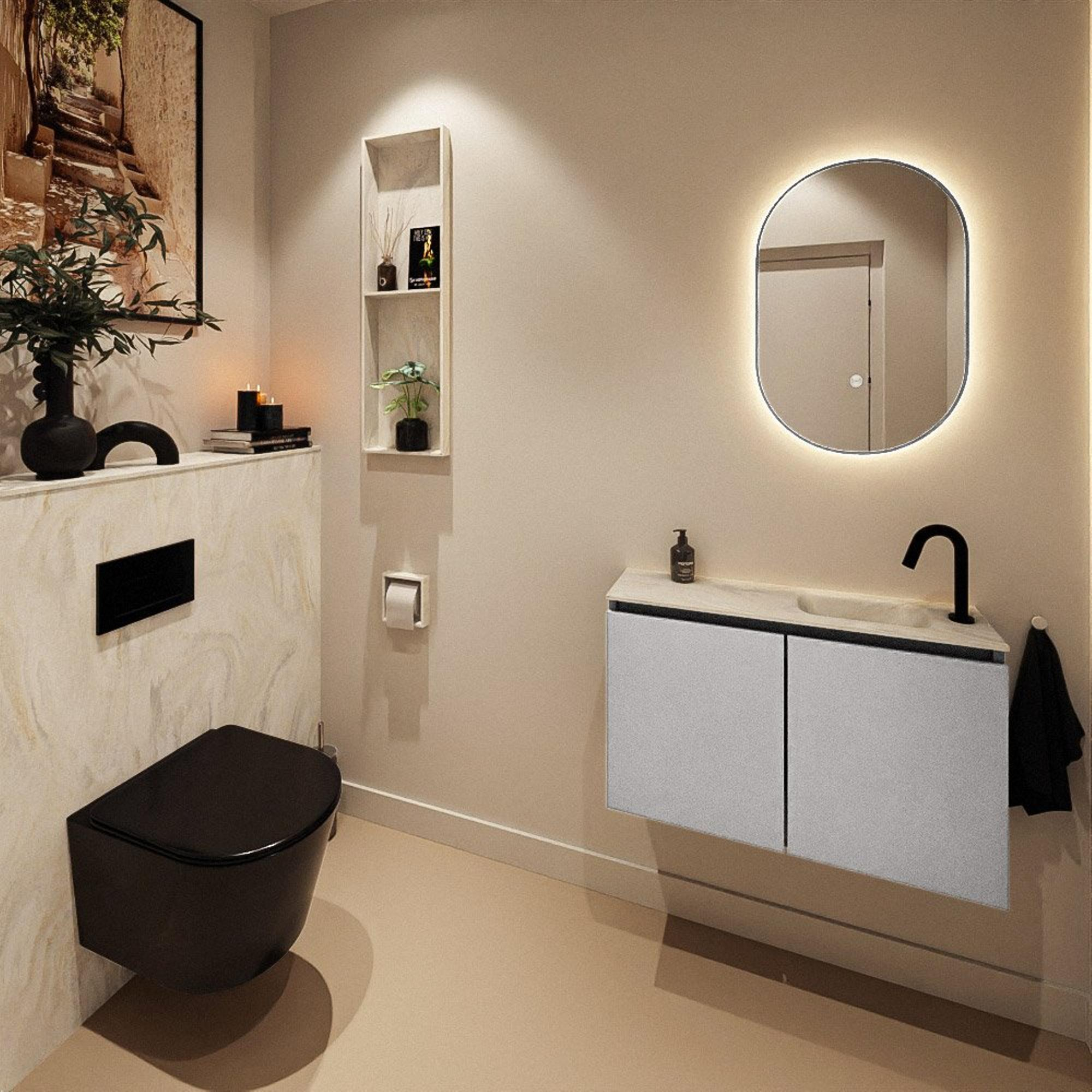 Avec une largeur de 80 cm et une profondeur de seulement 23 cm, ce meuble offre un bon compromis entre surface de plan et liberté de mouvement. La faible profondeur est idéale dans les WC étroits ou les petites salles de bains où chaque centimètre compte. Vous disposez néanmoins de suffisamment de place autour du robinet pour vous laver les mains, poser un distributeur de savon ou ajouter un petit accessoire. Comme le lavabo se trouve à droite, vous exploitez au mieux la longueur du mur et évitez que le robinet ne se trouve dans la zone de passage. Vous créez ainsi un passage dégagé et sûr, et l’espace paraît plus grand et plus calme. Cela rend ce meuble particulièrement adapté aux constructions neuves, aux rénovations et aux WC d’invités stylés.