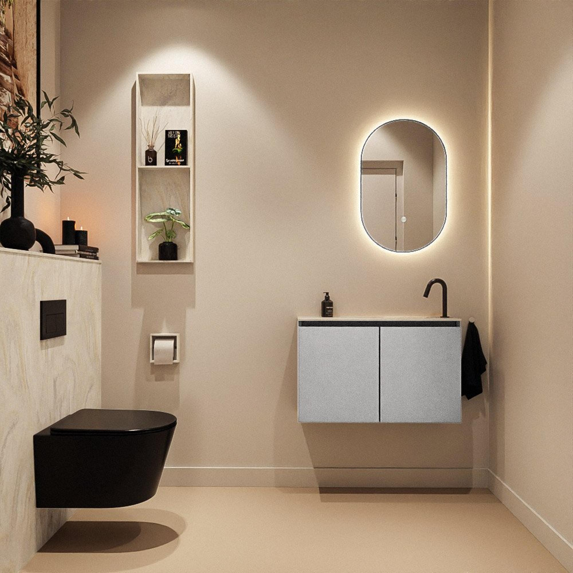 Ce meuble WC compact est idéal si vous souhaitez créer un look épuré et moderne dans une petite salle de bains, un espace WC ou une niche étroite, sans sacrifier le confort. Grâce à sa faible profondeur, c’est un choix astucieux si vous voulez conserver de l’espace de circulation tout en recherchant un véritable lavabo avec espace de rangement. La combinaison d’une couleur de meuble moderne avec un élégant lavabo crème en solid surface crée une apparence apaisante et haut de gamme qui s’accorde facilement avec des carreaux gris, blancs et dans des tons terre. Le lavabo avec trou de robinet à droite est particulièrement pratique lorsque l’arrivée d’eau ou la disposition de la porte l’exige. Vous obtenez ainsi une solution bien pensée et peu encombrante, qui est agréable tant visuellement qu’à l’usage quotidien, et qui durera de nombreuses années.