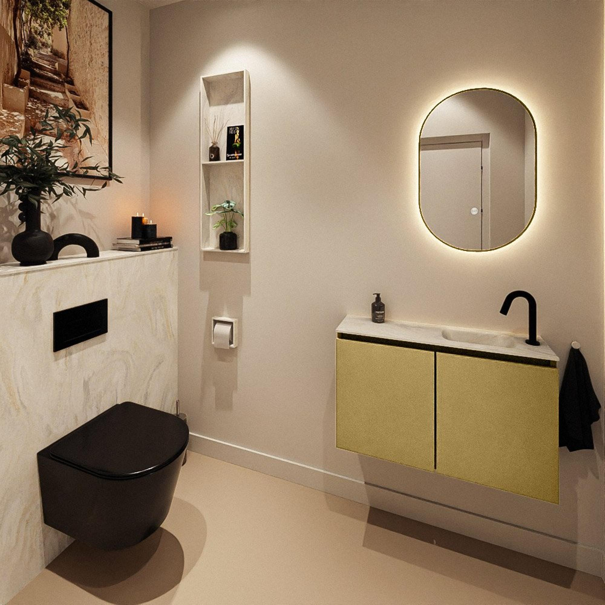 La finition dorée du meuble donne immédiatement à vos toilettes une apparence haut de gamme, digne d’un hôtel. Oro est une teinte dorée chaude et moderne qui se marie à merveille avec des murs clairs, des carreaux effet marbre ou au contraire un mur accent foncé. Grâce au design sans poignée, la façade reste entièrement lisse et sobre, ce qui confère à l’ensemble un aspect minimaliste et apporte une tranquillité visuelle dans un espace souvent réduit. Les lignes modernes du meuble s’accordent bien avec les styles de salles de bains contemporains et facilitent l’association avec d’autres accessoires dorés ou noirs, tels qu’un robinet de lave-mains, un porte-rouleau de papier toilette ou un petit crochet porte-serviette. Vous créez ainsi, avec un seul meuble, un look cohérent et bien pensé.