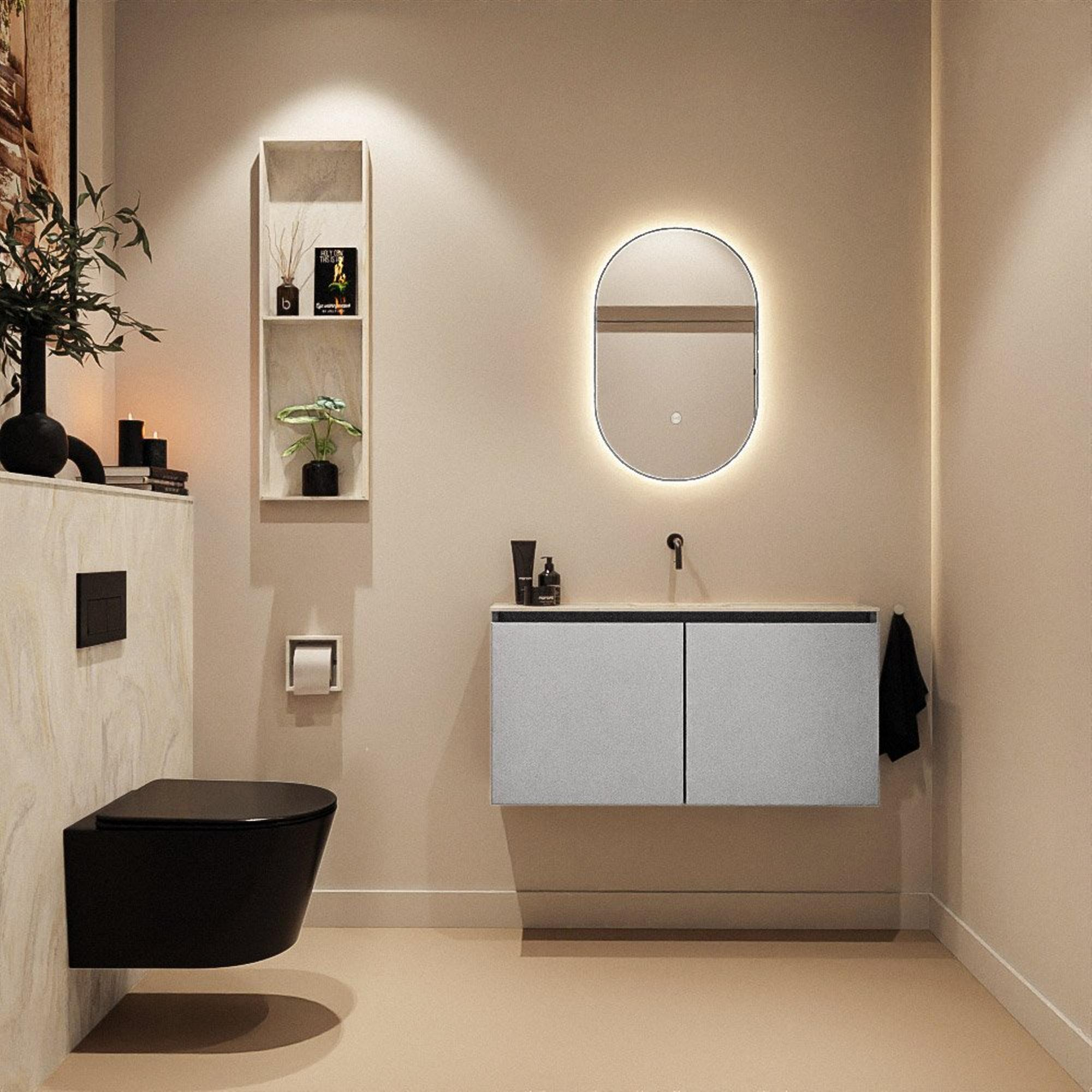 Si vous recherchez une solution luxueuse mais compacte pour vos toilettes ou une petite salle de bains, ce meuble est un choix judicieux. Grâce à sa faible profondeur, il s’intègre parfaitement dans un espace étroit ou des toilettes de couloir, sans que vous ne perdiez de précieuse zone de passage. La combinaison d’un meuble bas moderne dans une teinte grise et d’un lavabo en solid surface aux lignes épurées avec cuve centrale offre un aspect calme et ordonné, de sorte que même de petites toilettes paraissent plus spacieuses. Comme il n’y a pas de trou de robinet, il est idéal à combiner avec un robinet mural élégant, ce qui rend l’apparence encore plus minimaliste. Avec deux portes, vous disposez en outre de suffisamment d’espace de rangement pour les rouleaux de papier toilette, les serviettes invité et les produits d’entretien, de sorte que tout reste bien hors de vue et que vos toilettes aient toujours un aspect soigné. Ce meuble convient donc particulièrement à ceux qui veulent combiner fonctionnalité, design et finition haut de gamme dans un espace compact.