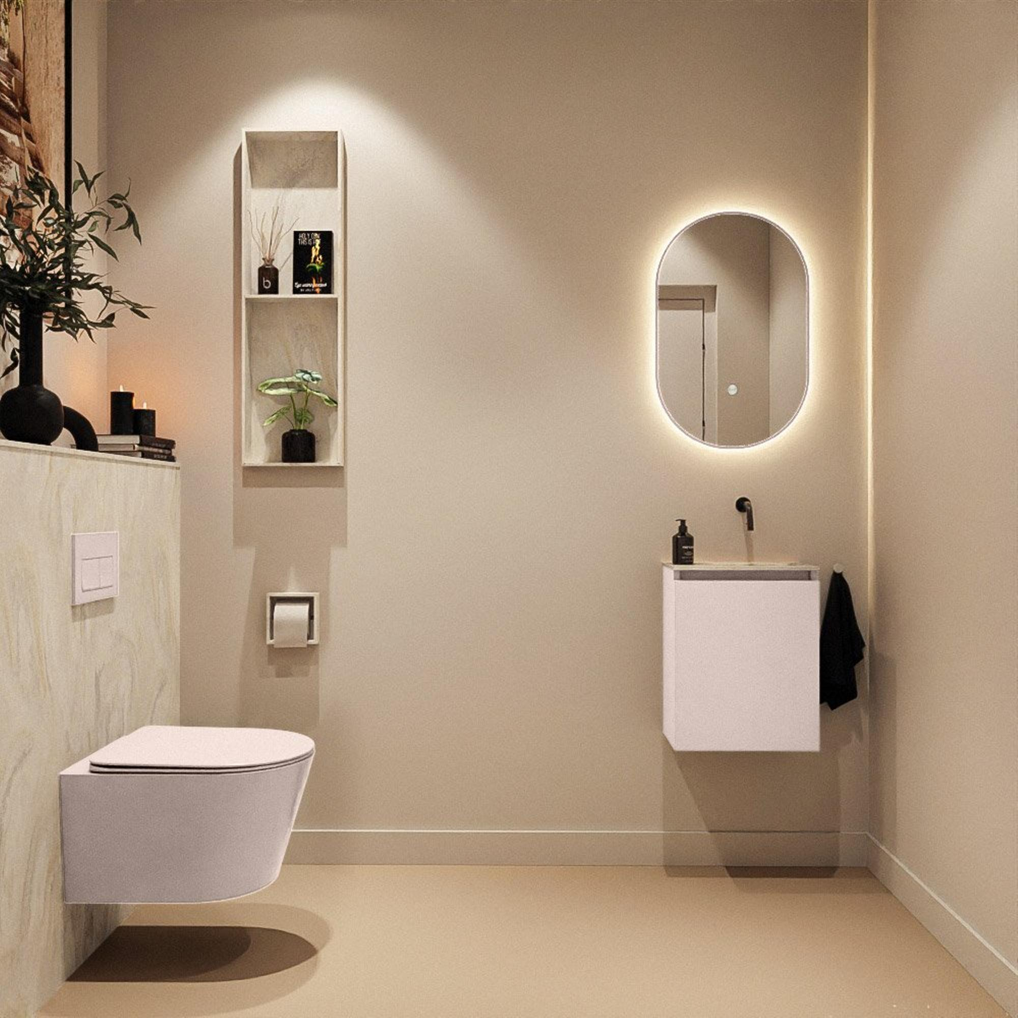 Avec une largeur de 40 cm et une profondeur de seulement 23 cm, ce meuble de toilettes est parfait pour les petits espaces où l’espace de circulation est important. La couleur subtile Rosee offre une apparence douce et luxueuse et forme un contraste élégant avec le lavabo couleur crème. Comme la cuve est placée sur le côté droit, il reste de la place à gauche pour un passage confortable ou pour un radiateur, des toilettes ou une porte. Les façades sans poignées s’intègrent parfaitement au style d’habitat moderne : des lignes apaisées, aucune poignée saillante qui gêne et un look minimaliste qui donne immédiatement une impression d’ordre et d’espace. Vous créez ainsi un bel ensemble, même si votre espace toilettes est limité.