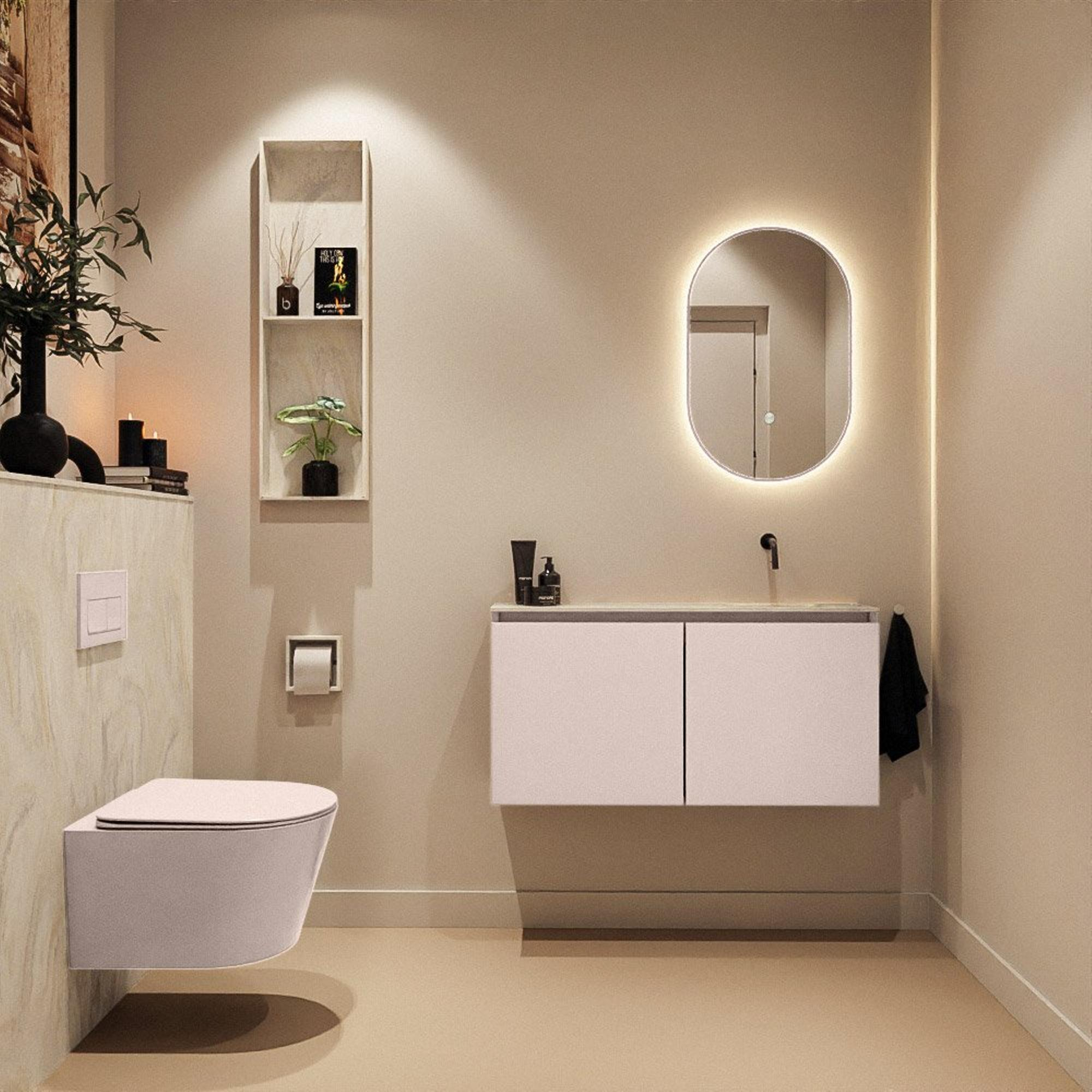 La base du meuble est réalisée dans une teinte rosée douce et moderne (Rosee), combinée à un plan vasque crème en solid surface. Cette combinaison assure un look chaleureux et contemporain qui se marie parfaitement avec des carreaux clairs, des sols aspect béton ou des robinets noirs et dorés. Le design sans poignées renforce l’aspect épuré et minimaliste et permet de combiner facilement ce meuble avec d’autres produits sanitaires modernes. La couleur subtile du plan adoucit l’ensemble, de sorte que vos toilettes ne paraissent ni froides ni cliniques, mais au contraire accueillantes et soignées. Vous créez ainsi, même dans un petit espace, une apparence luxueuse et réfléchie.