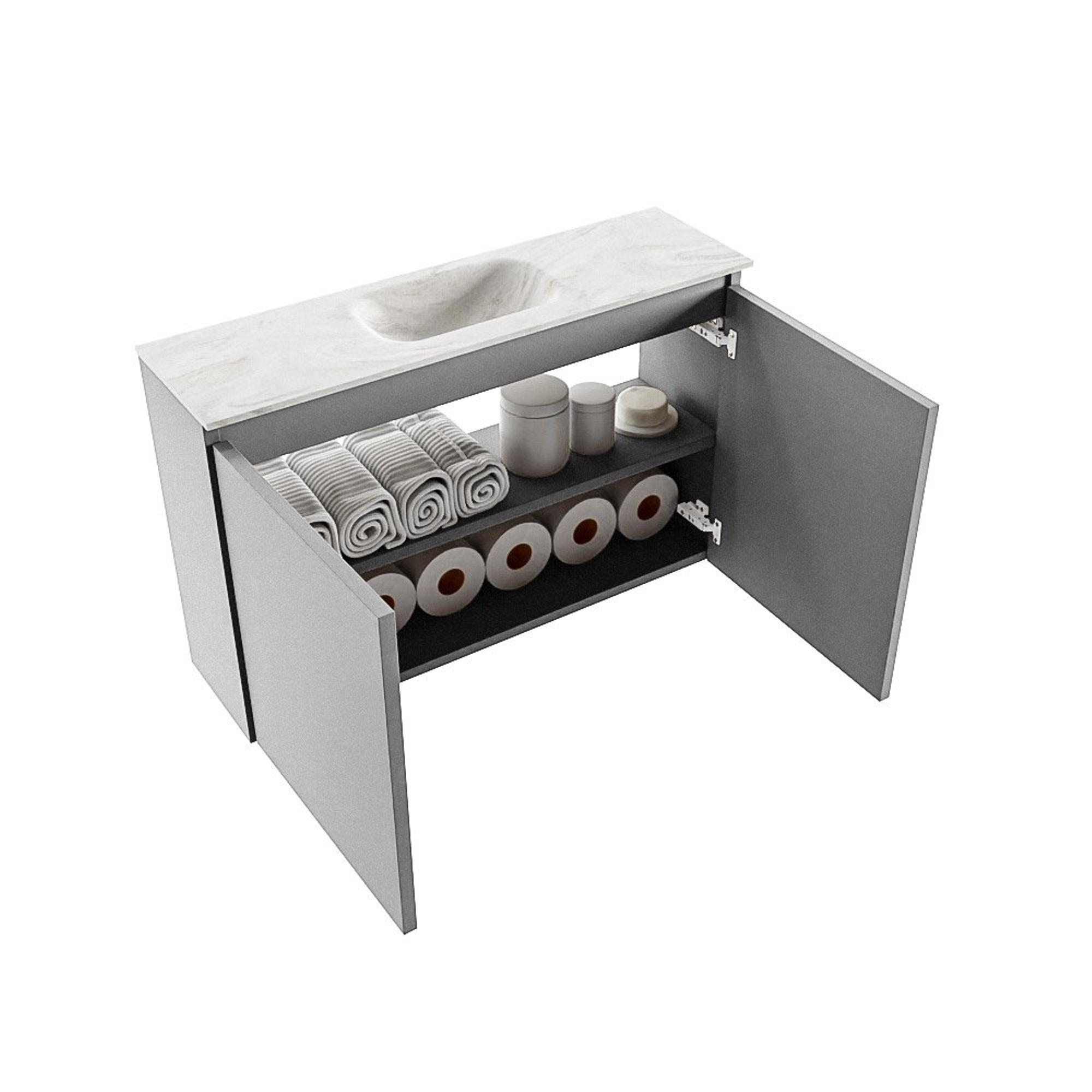 Avec une largeur de 80 cm et une profondeur de seulement 23 cm, ce meuble est particulièrement adapté aux petites toilettes, couloirs ou salles de bains compactes. La faible profondeur permet de conserver suffisamment d'espace de circulation, sans sacrifier le confort lors du lavage des mains. La vasque est positionnée au centre, ce qui donne un ensemble bien équilibré et vous permet de garder un accès facile au robinet. Cela rend également le meuble idéal pour les maisons familiales très fréquentées ou les toilettes d'invités où la fonctionnalité et la circulation sont importantes. Grâce à son format bien pensé, vous bénéficiez d'une apparence généreuse tout en gardant un espace pratique à l'usage.